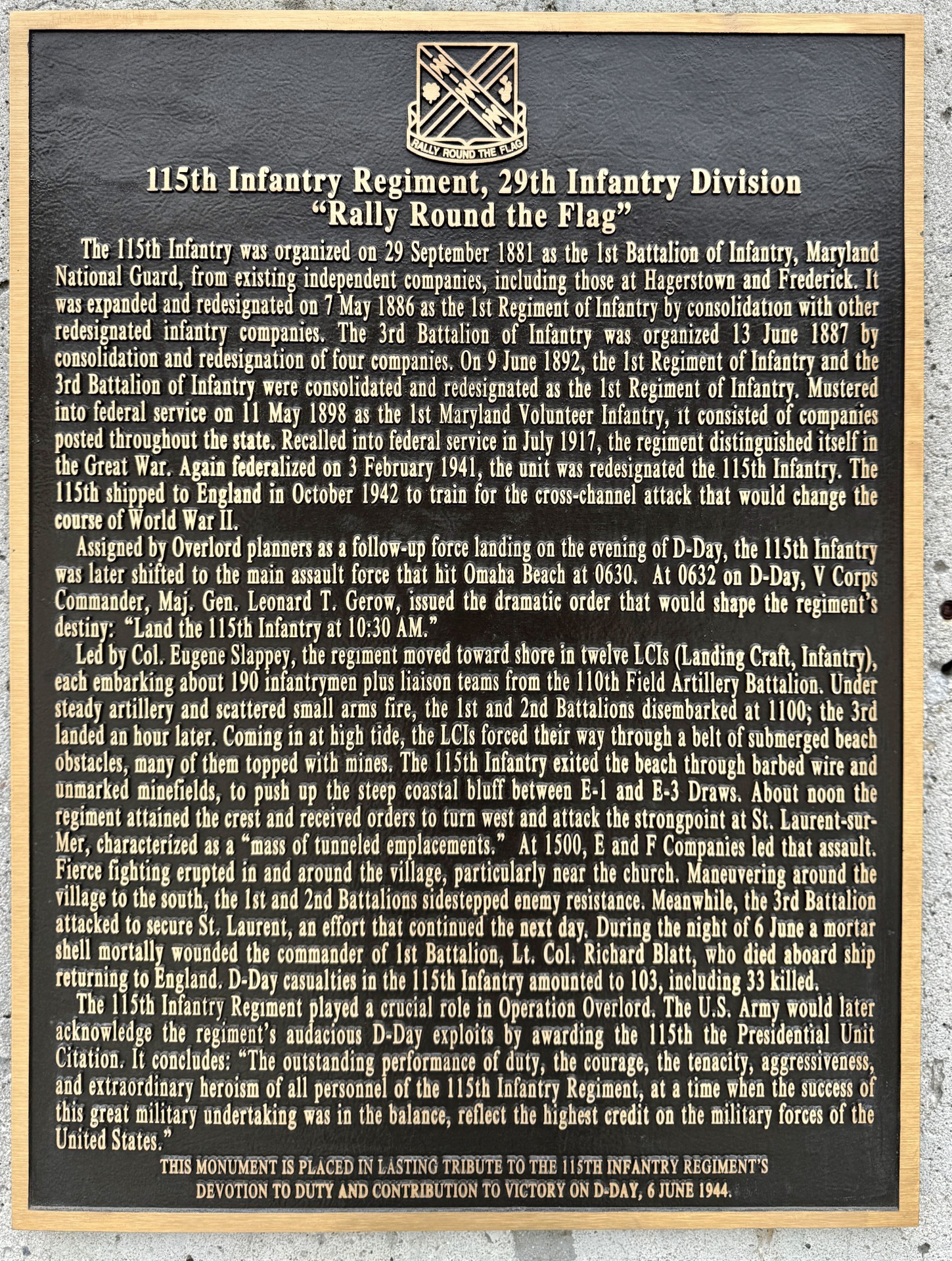 115TH INFANTRY REGIMENT, 29TH INFANTRY DIVISION WAR MEMORIAL PLAQUE