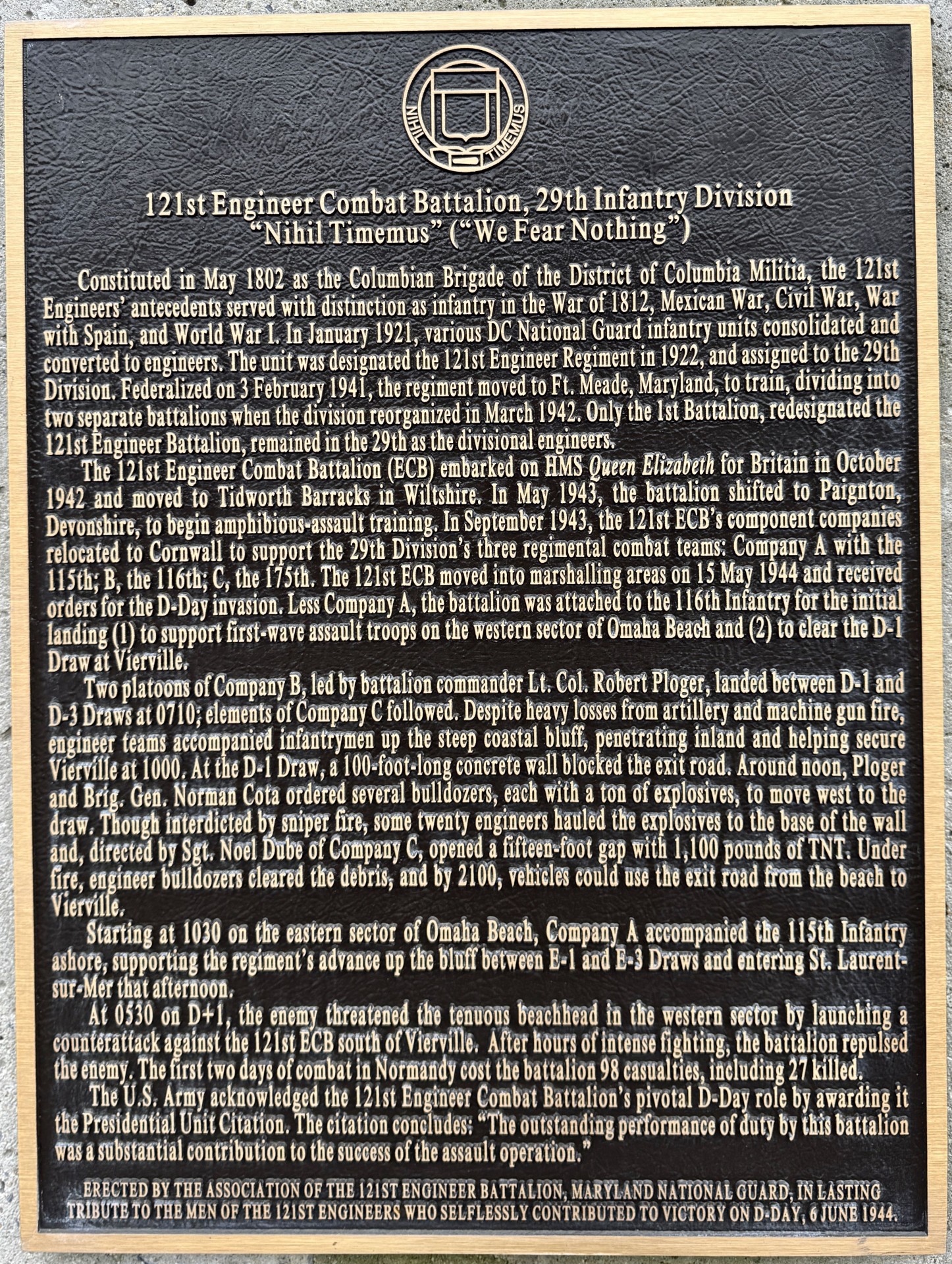121ST ENGINEER COMBAT BATTALION, 29TH INFANTRY DIVISION WAR MEMORIAL PLAQUE
