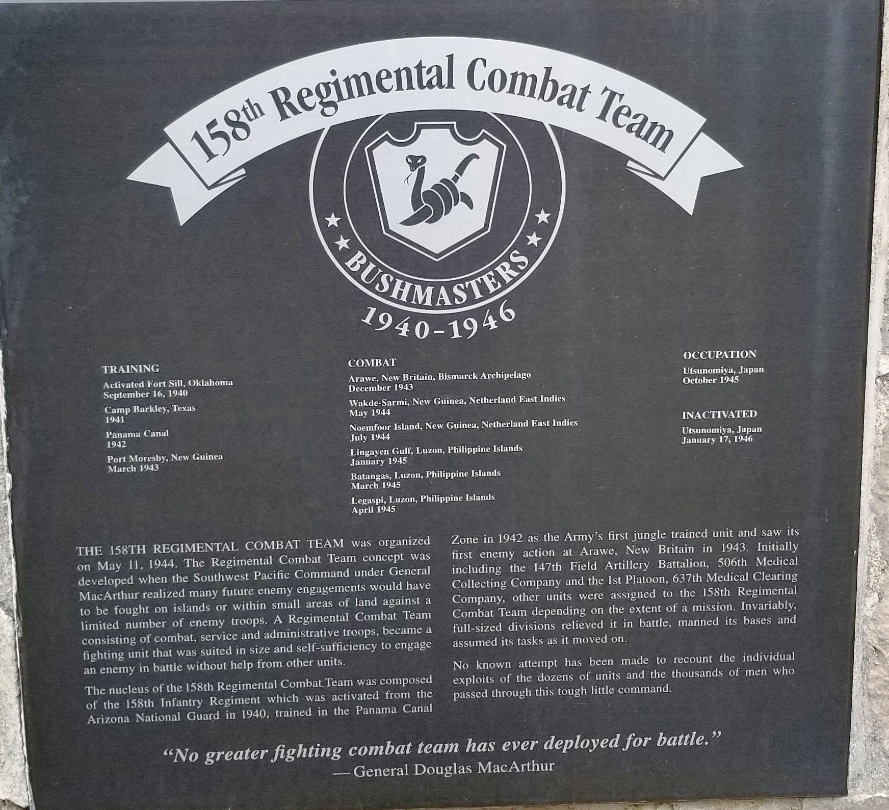 158TH REGIMENTAL COMBAT TEAM WAR MEMORIAL PLAQUE