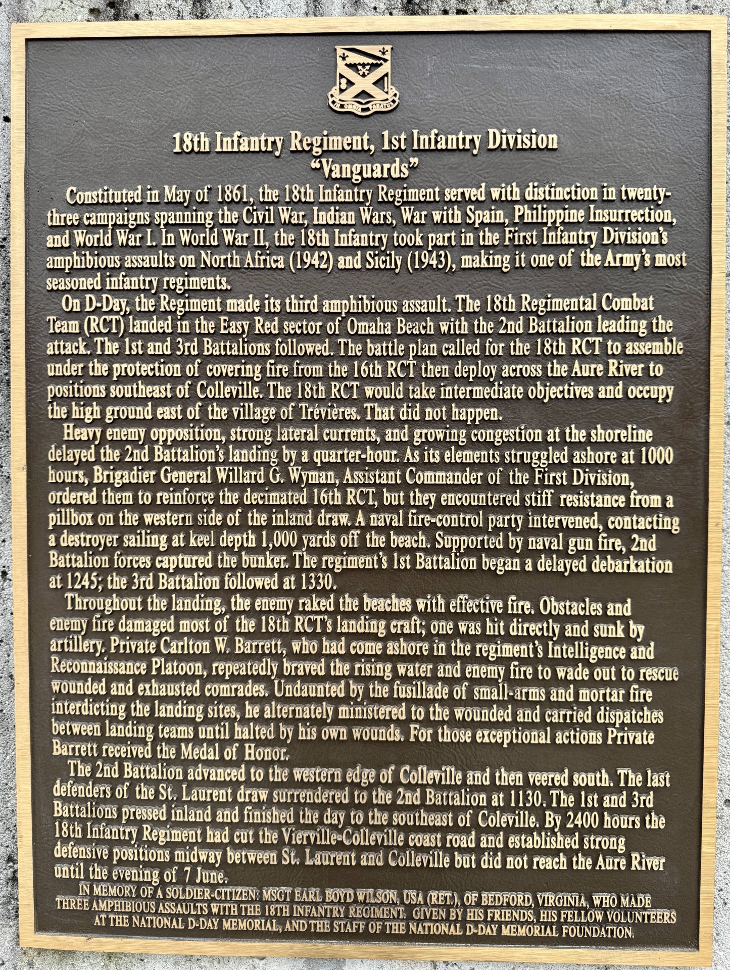 18TH INFANTRY REGIMENT, 1ST INFANTRY DIVISION WAR MEMORIAL PLAQUE