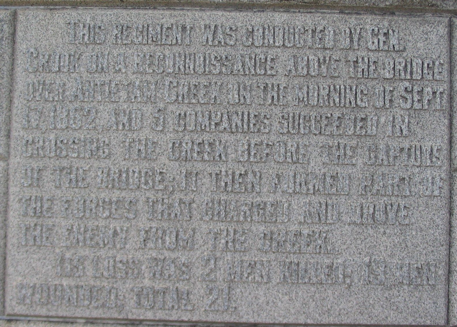 This Regiment was conducted by Gen. Crook on a reconnaissance above the Bridge over Antietam Creek on the morning of Sept. 17, 1862, and 5 companies succeeded in crossing the Creek before the capture of the bridge; it then formed part of the forces that charged and drove the enemy from the creek.