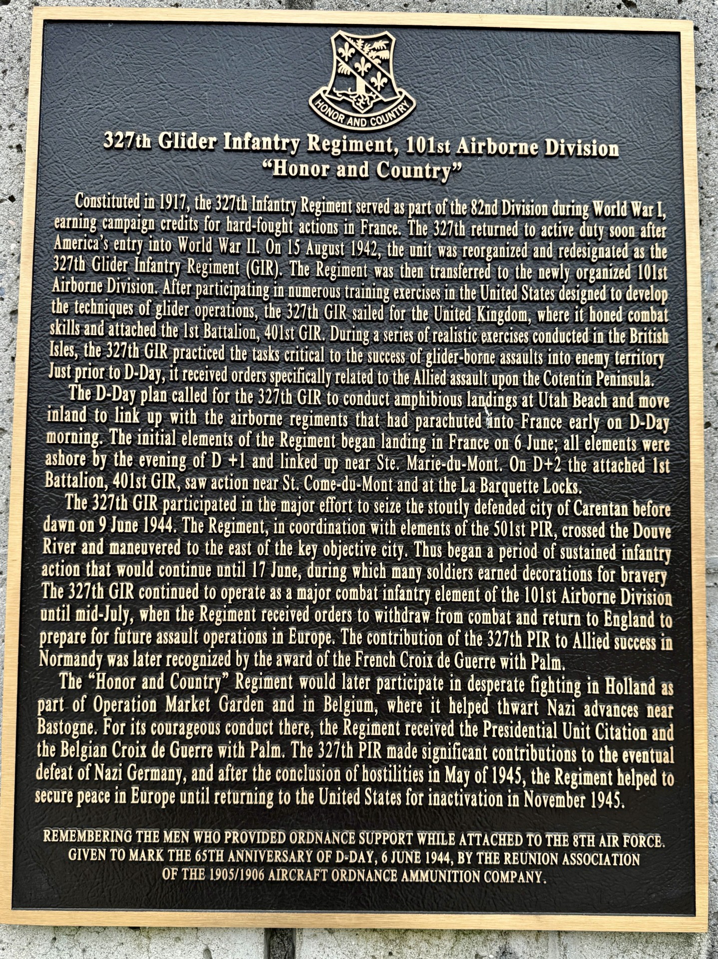 327TH GLIDER INFANTRY REGIMENT, 101ST AIRBORNE DIVISION WAR MEMORIAL PLAQUE