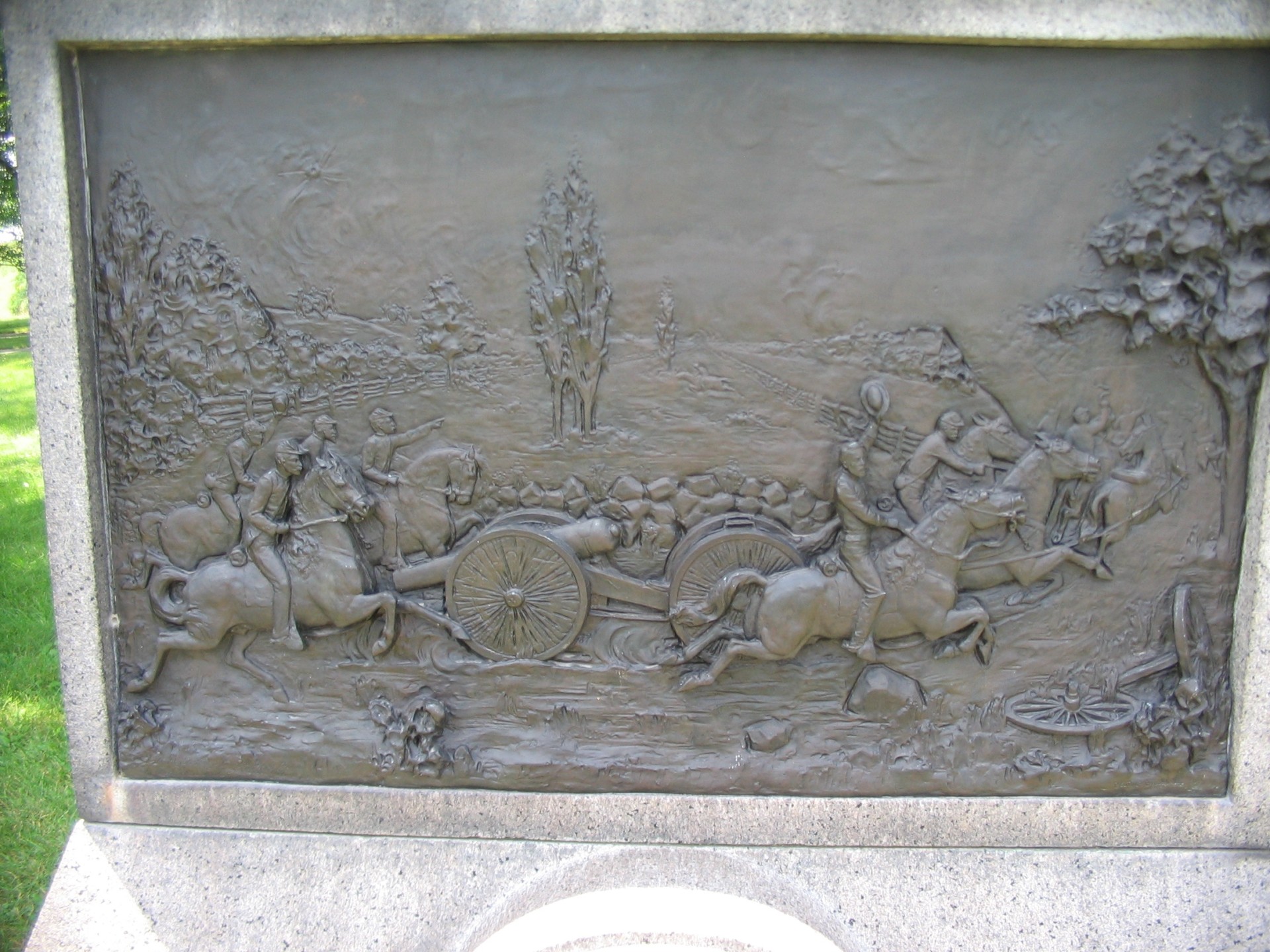 THE RELIEF DEPICTS A GUN RUSHING INTO BATTLE, PAST A DAMAGED GUN.