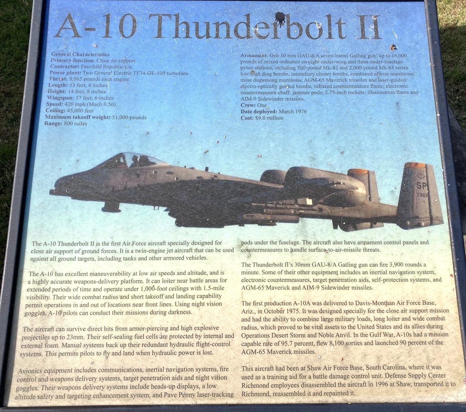 A-10 THUNDERBOLT II WAR MEMORIAL PANEL