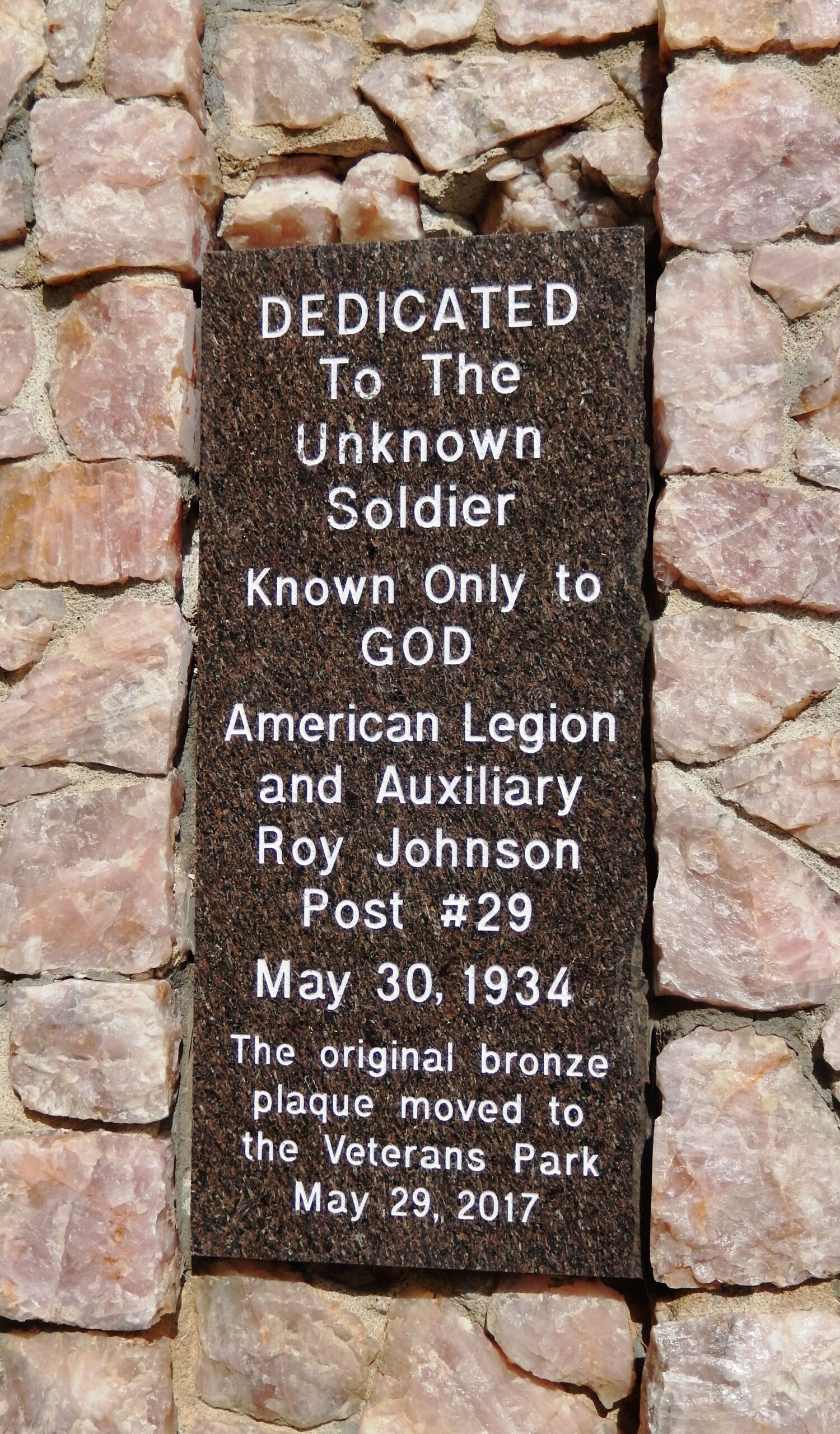 AMERICAN LEGION POST #29 UNKNOWN SOLDIER MEMORIAL PLAQUE