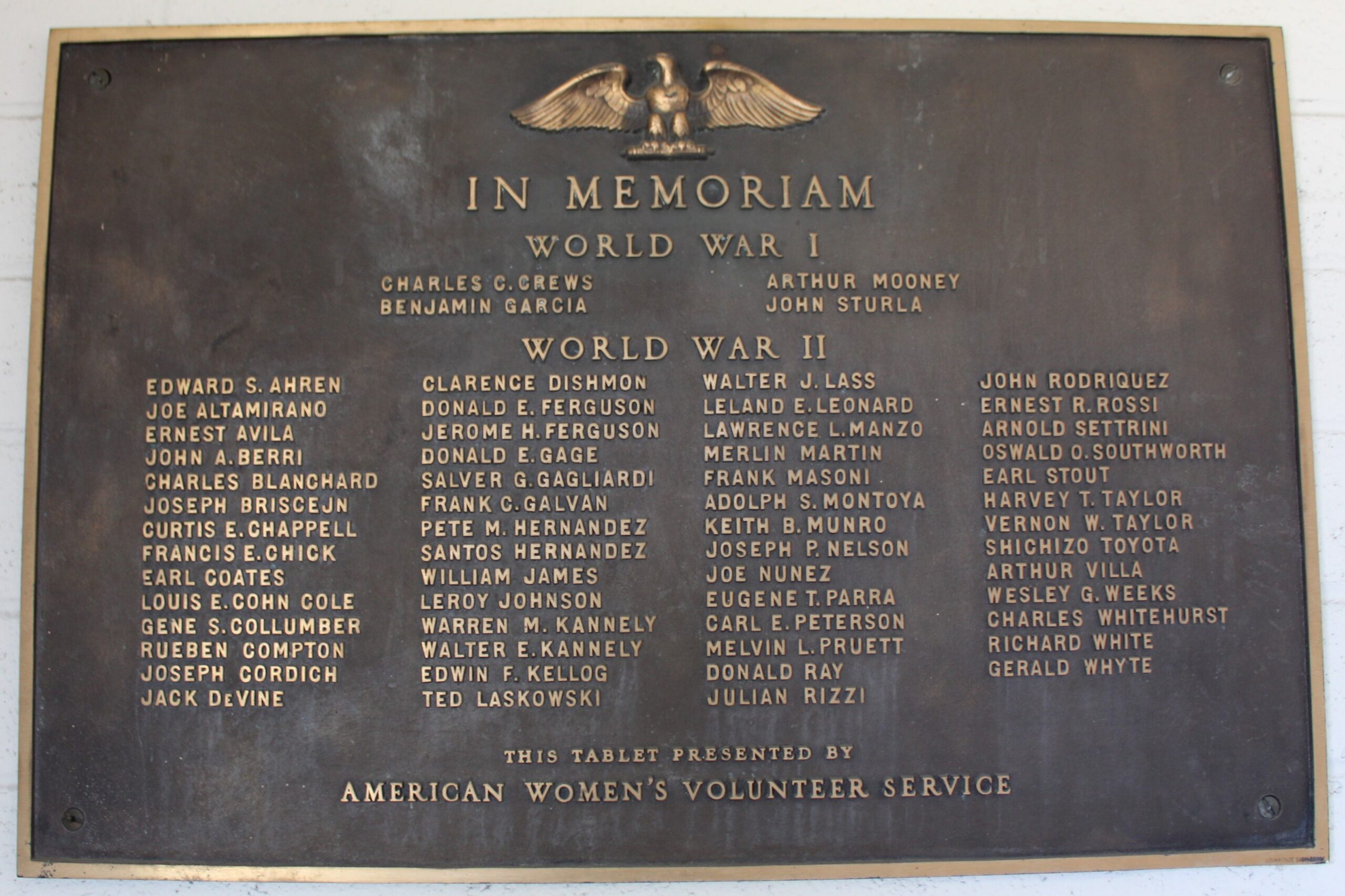 AMERICAN WOMEN VOLUTEER SEVICE WAR VETERANS MEMORIAL PLAQUE