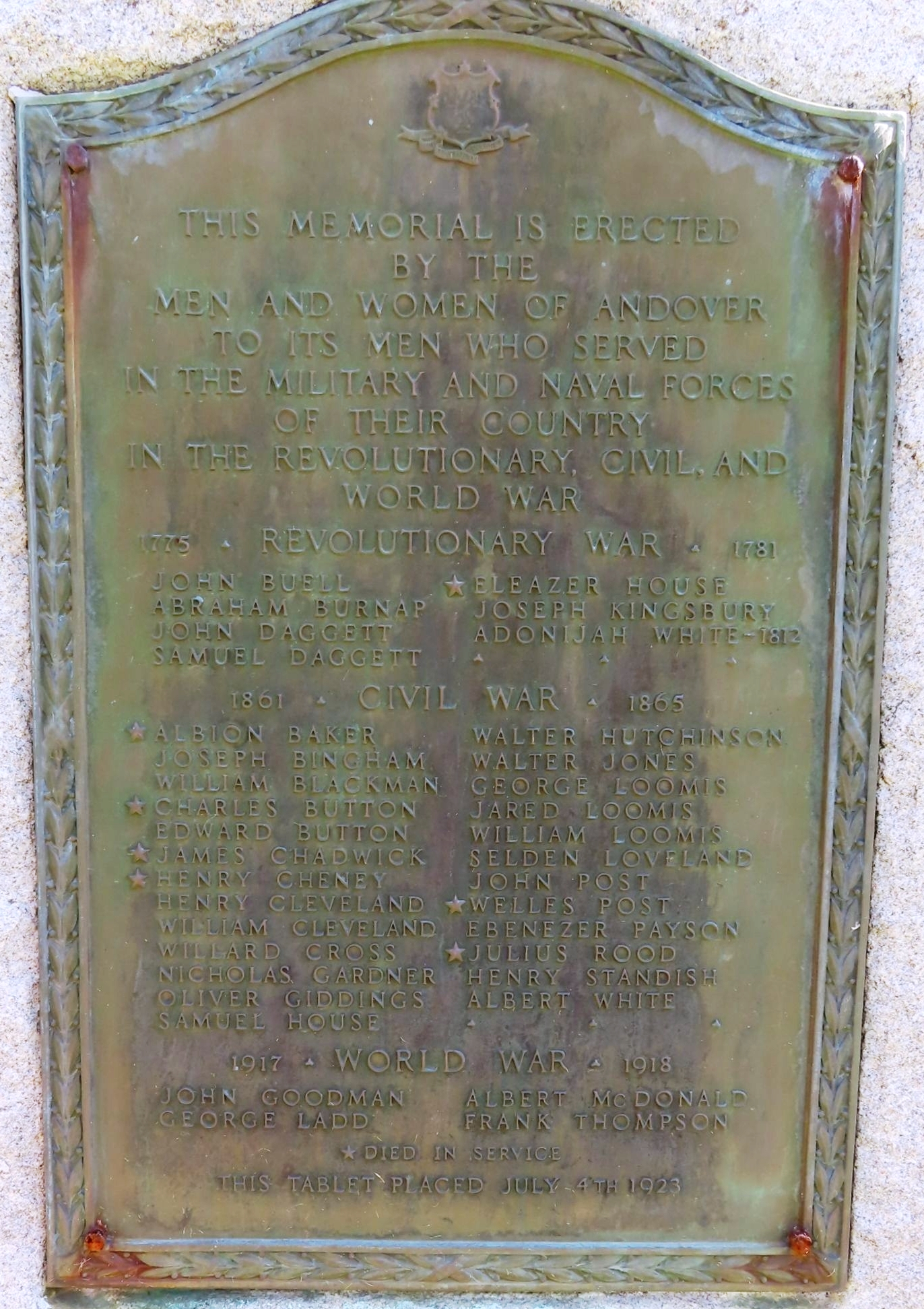 THIS MEMORIAL IS ERECTED BY THE MEN AND WOMEN OF ANDOVER TO ITS MEN WHO SERVED IN THE MILITARY AND NAVAL FORCES OF THEIR COUNTRY