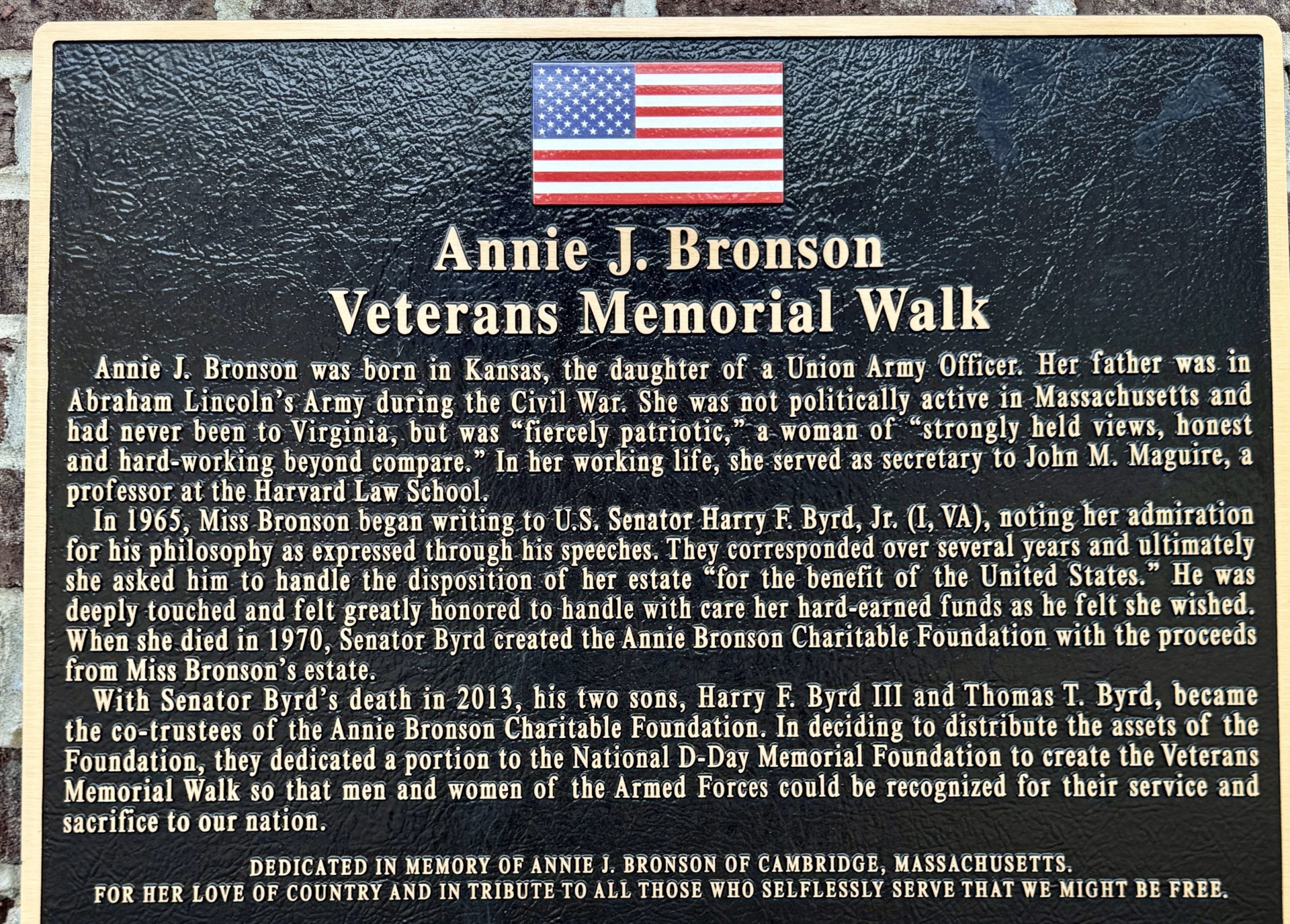 ANNIE J. BRONSON VETERANS MEMORIAL WALK PLAQUE
