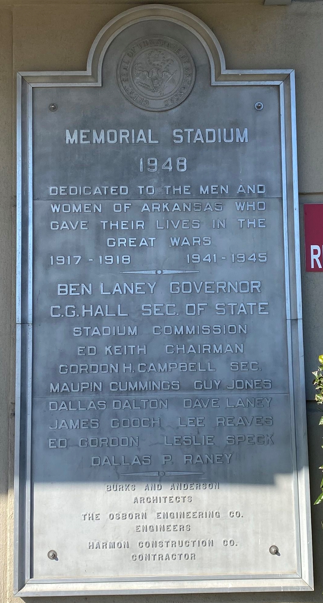 ARKANSAS WAR MEMORIAIL STADIUM PLAQUE