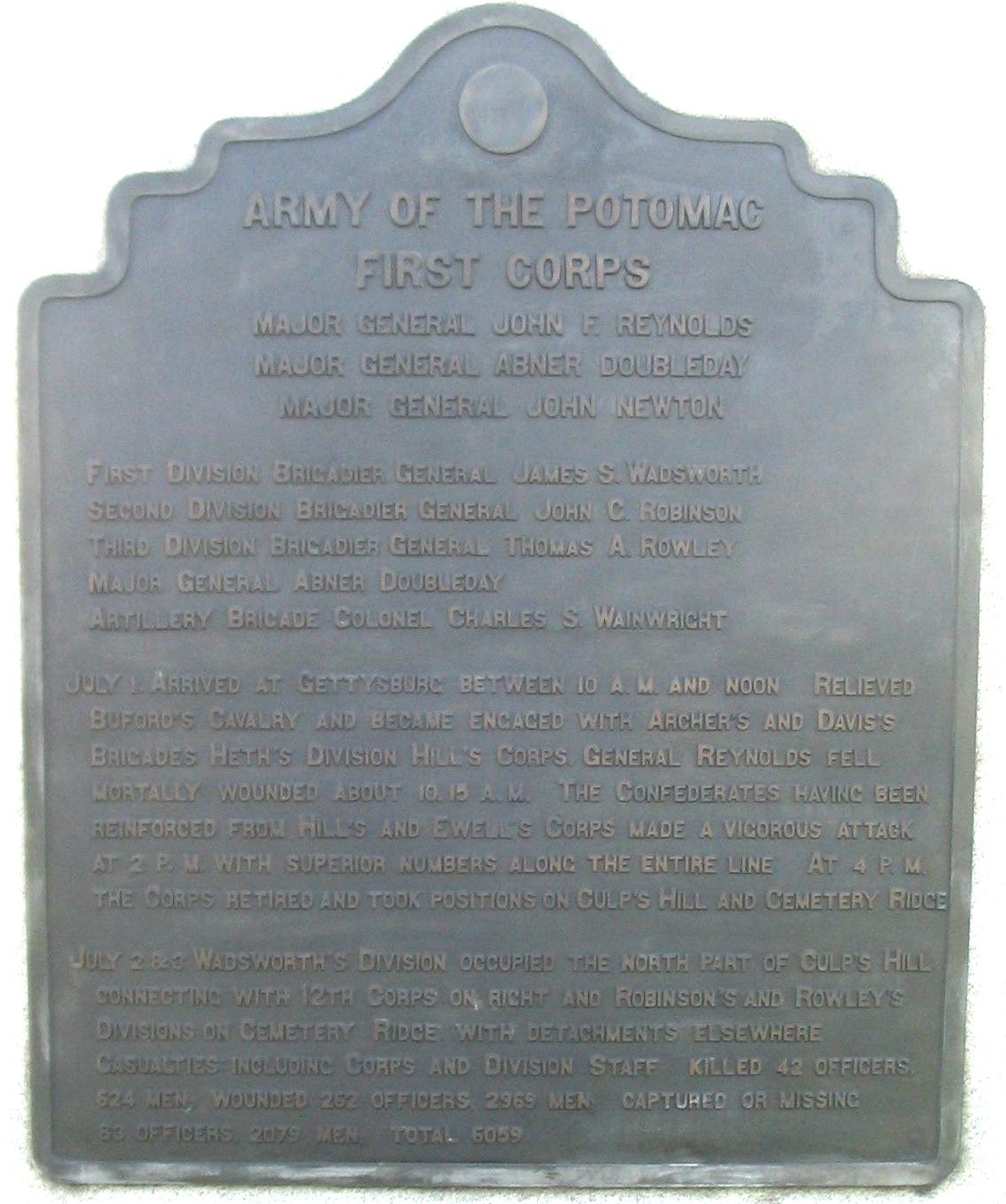 ARMY OF THE POTOMAC FIRST CORPS WAR MEMORIAL PLAQUE