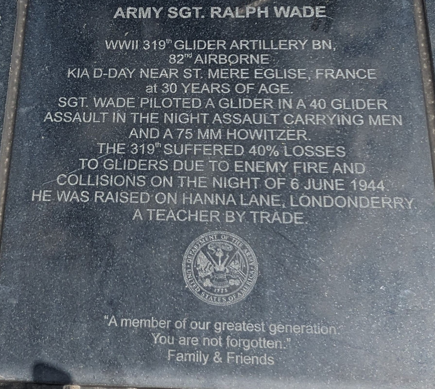 ARMY SGT. RALPH WADE WAR MEMORIAL PLAQUE