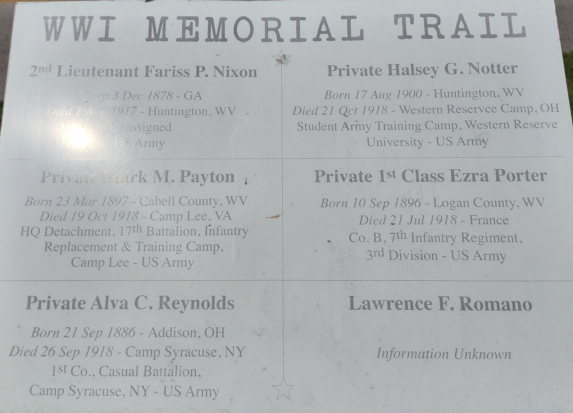 CABELL COUNTY WWI MEMORIAL TRAIL PLAQUE G