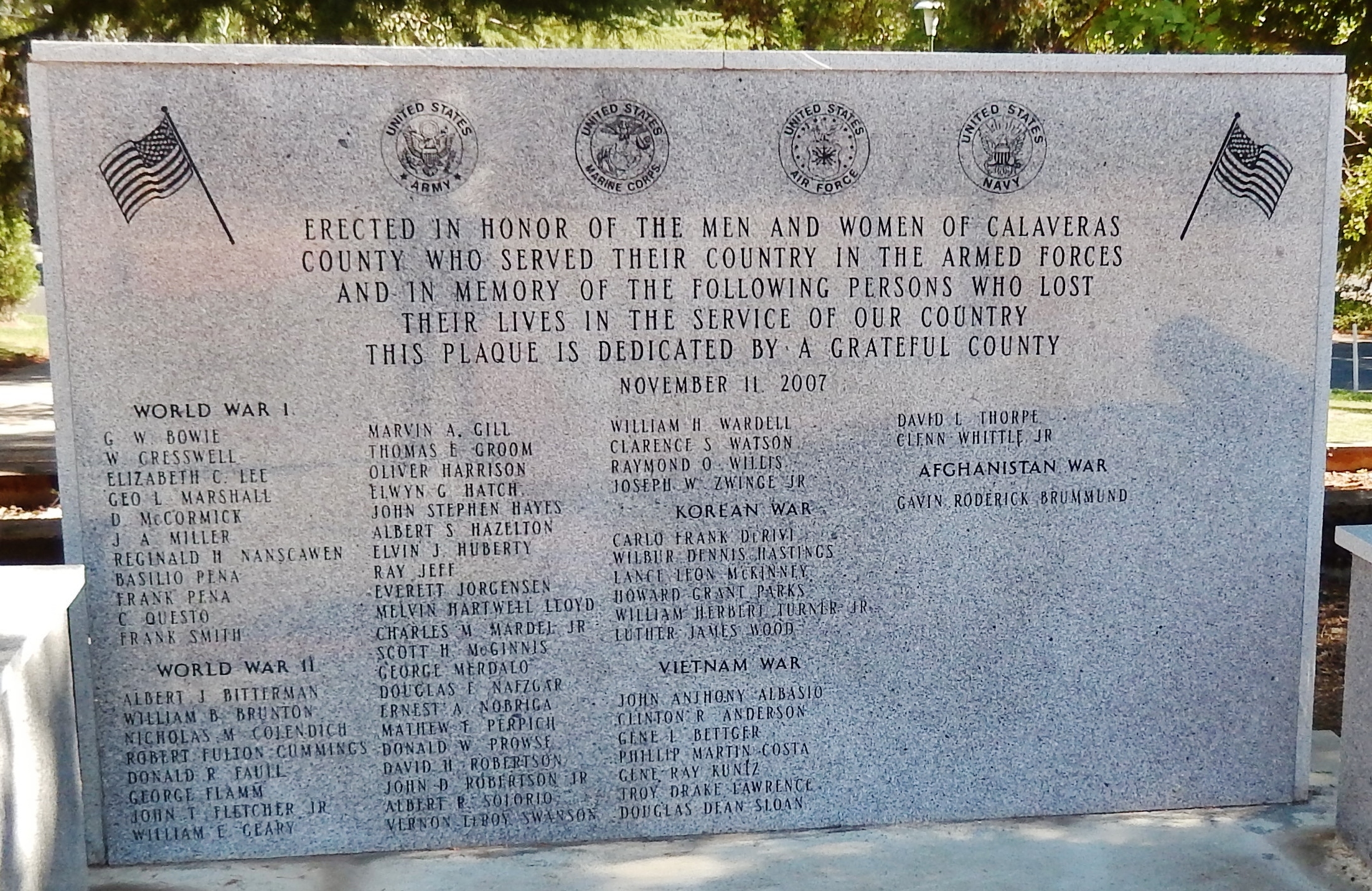 CALAVERAS COUNTY WAR VETERANS MEMORIAL HONOR ROLL STONE
