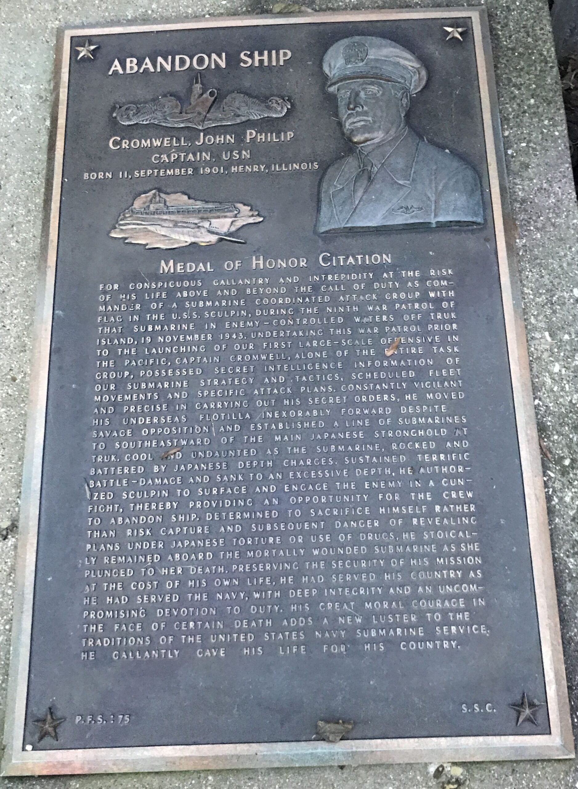 For conspicuous gallantry and intrepidity at the risk of his life above and beyond the call of duty as Commander of a Submarine Coordinated Attack Group with Flag in the U.S.S. Sculpin, during the Ninth War Patrol of that vessel in enemy-controlled waters off Truk Island, November 19, 1943. Undertaking this patrol prior to the launching of our first large-scale offensive in the Pacific, Captain Cromwell, alone of the entire Task Group, possessed secret intelligence information of our submarine strategy and tactics, scheduled Fleet movements and specific attack plans. Constantly vigilant and precise in carrying out his secret orders, he moved his underseas flotilla inexorably forward despite savage opposition and established a line of submarines to southeastward of the main Japanese stronghold at Truk. Cool and undaunted as the submarine, rocked and battered by Japanese depth-charges, sustained terrific battle damage and sank to an excessive depth, he authorized the Sculpin to surface and engage the enemy in a gun-fight, thereby providing an opportunity for the crew to abandon ship. Determined to sacrifice himself rather than risk capture and subsequent danger of revealing plans under Japanese torture or use of drugs, he stoically remained aboard the mortally wounded vessel as she plunged to her death. Preserving the security of his mission at the cost of his own life, he had served his country as he had served the Navy, with deep integrity and an uncompromising devotion to duty. His great moral courage in the face of certain death adds new luster to the traditions of the United States Naval Service. He gallantly gave his life for his country.
