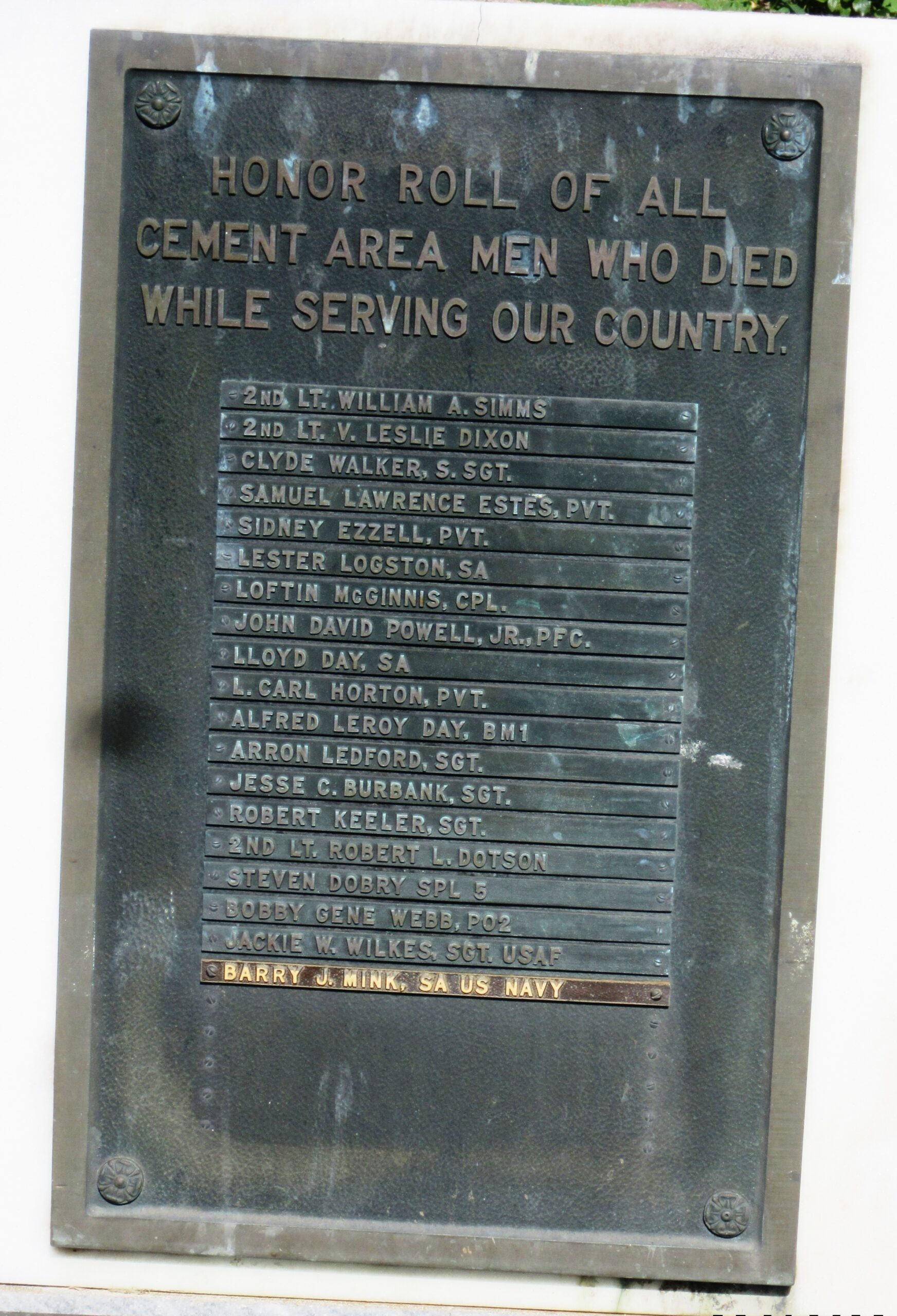CEMENT AREA VETERANS MEMORIAL AND PEACE GARDEN PLAQUE B