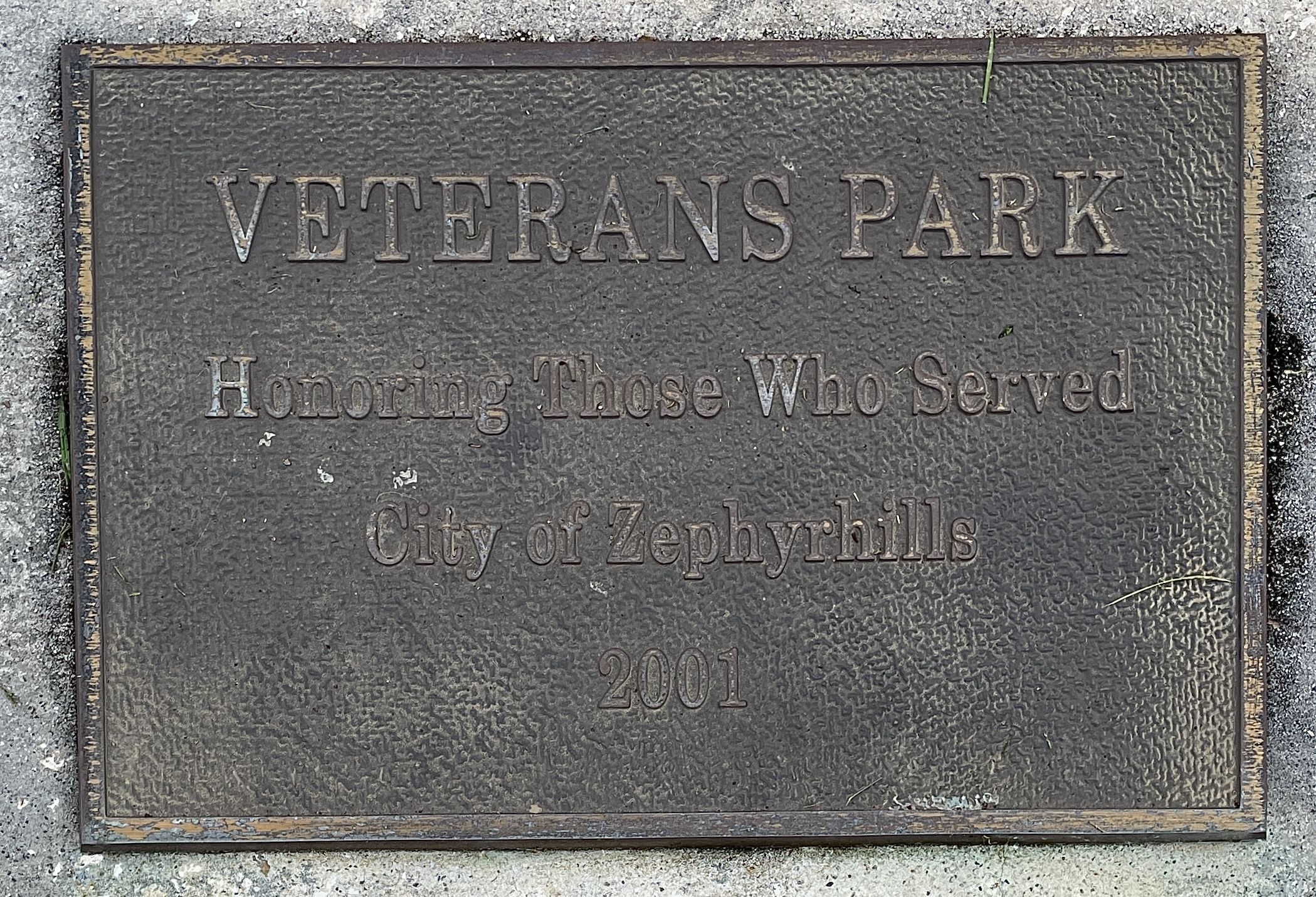 CITY OF ZEPHYRHILLS VETERANS PARK MEMORIAL PLAQUE