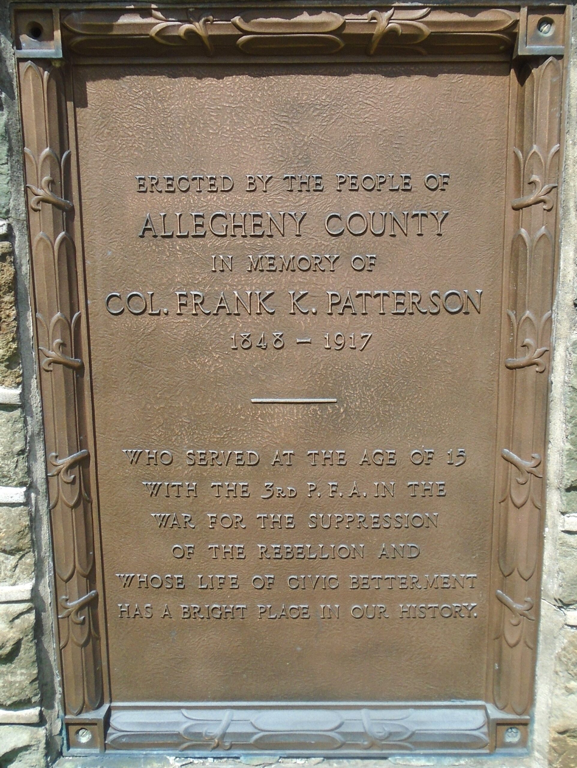 COL. FRANK K. PATTERSON WAR MEMORIAL PLAQUE