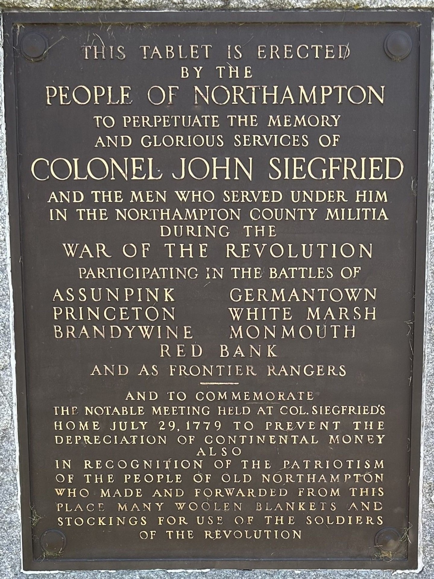 COLONEL JOHN SIEGFRIED REVOLUTIONARY WAR MEMORIAL PLAQUE
