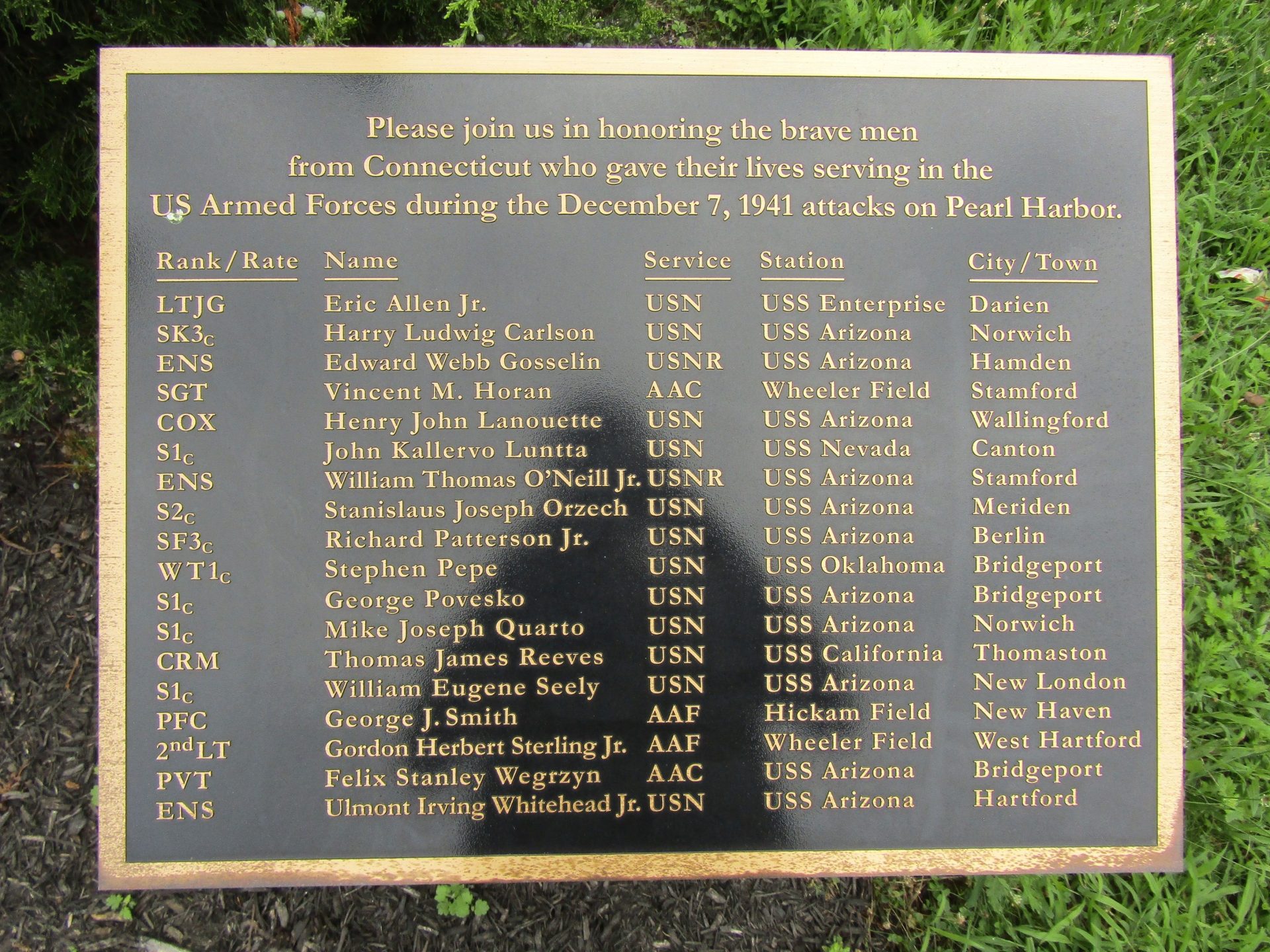 CONNECTICUT PEARL HARBOR WAR MEMORIAL PLAQUE