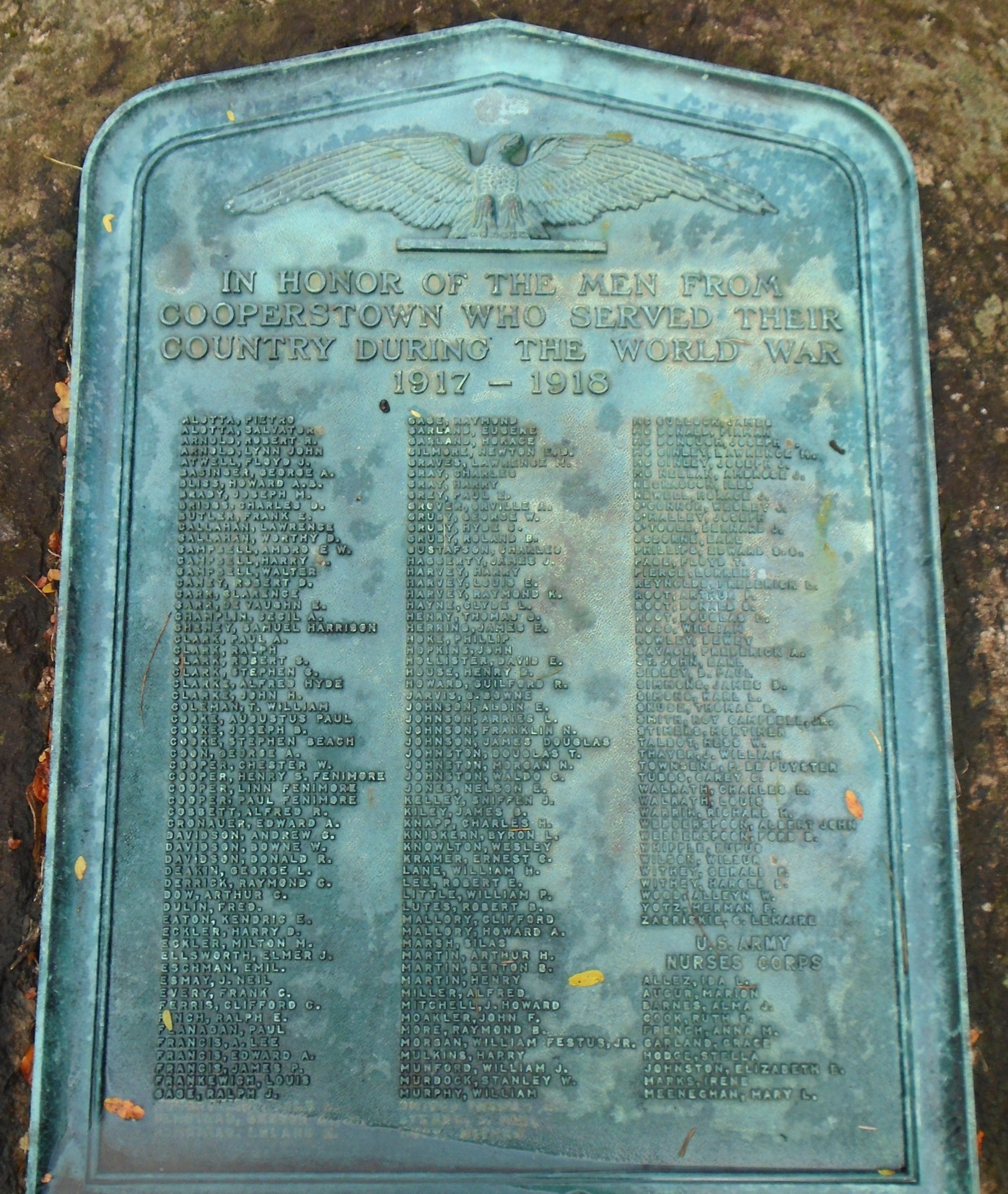 COOPERSTOWN WORLD WAR VETERANS MEMORIAL PLAQUE