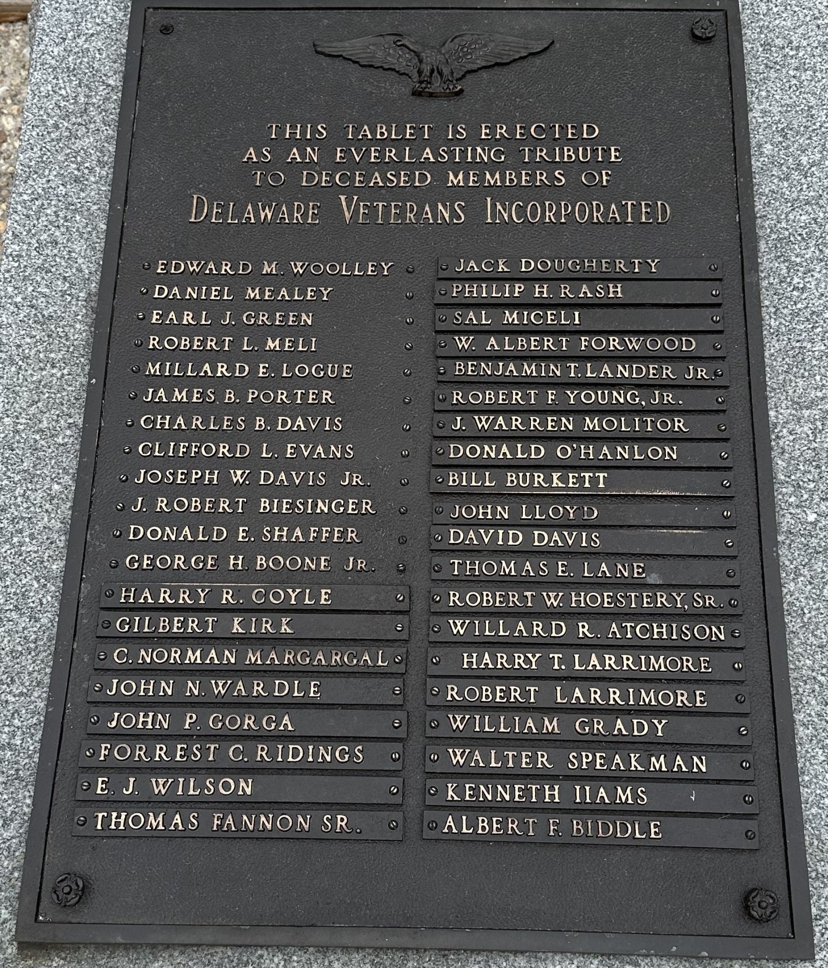 DELAWARE VETERANS DECEASED MEMBERS MEMORIAL PLAQUE A