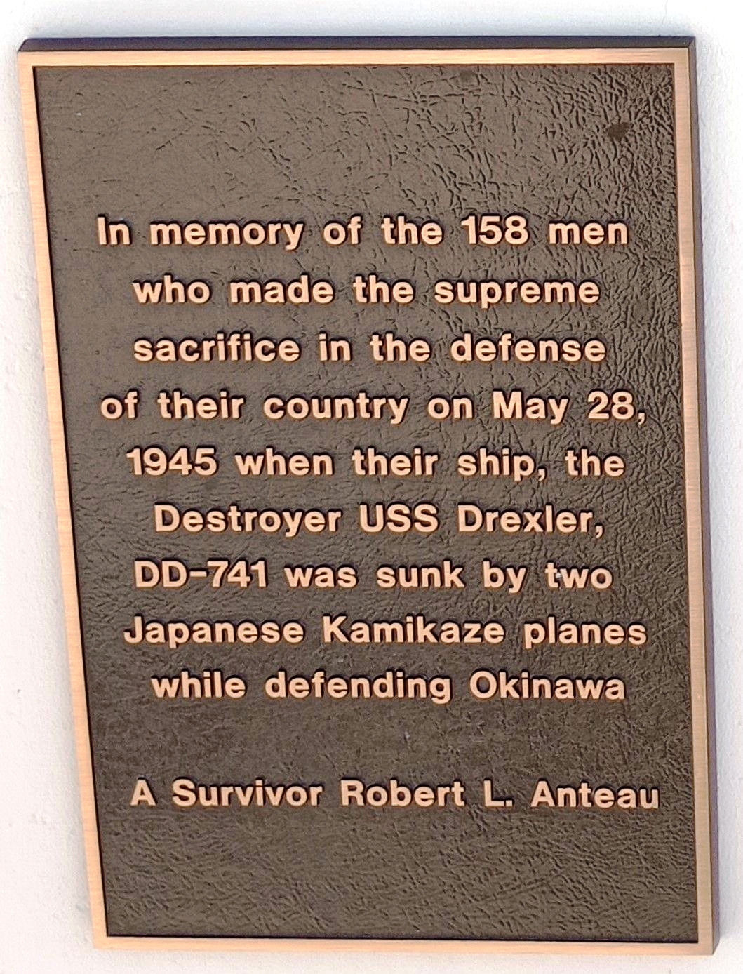 DESTROYER USS DEXTER, DD-741 WAR MEMORIAL PLAQUE