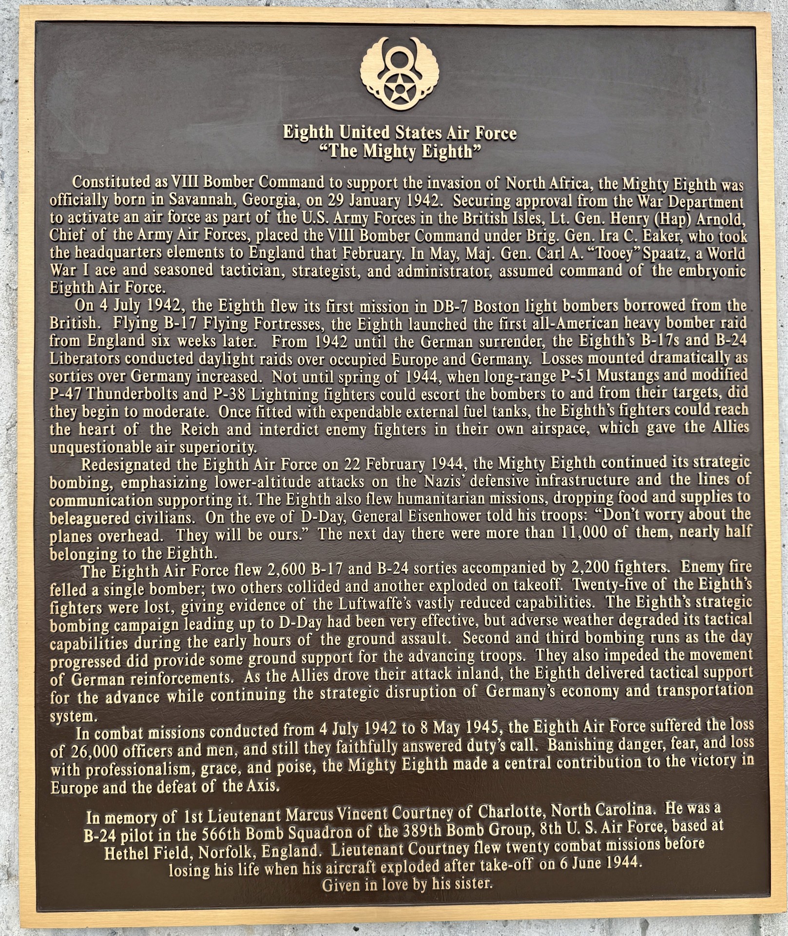 EIGHT UNITED STATES AIR FORCE WAR MEMORIAL PLAQUE
