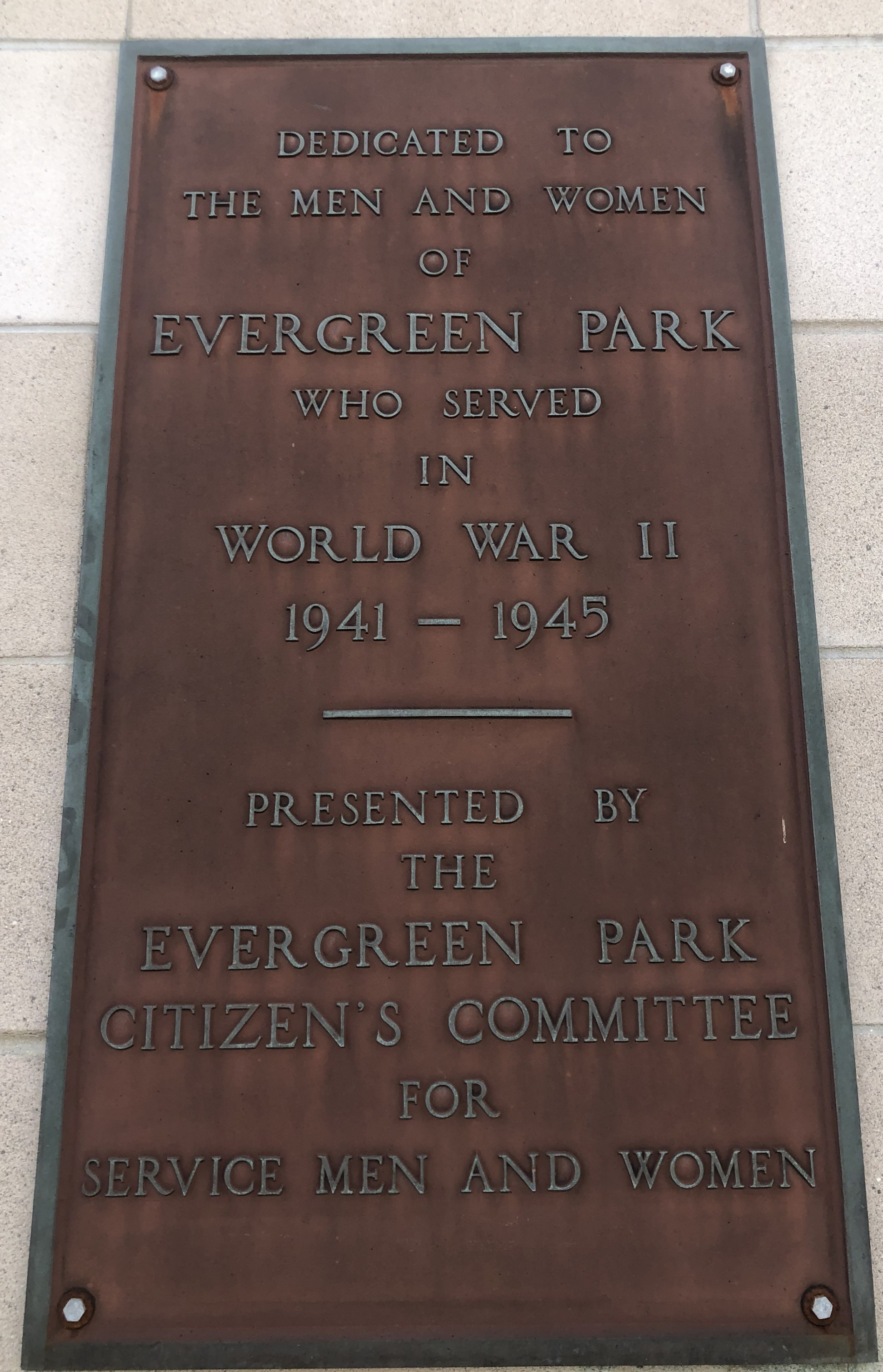 EVERGREEN PARK WAR VETERANS MEMORIAL PLAQUE A