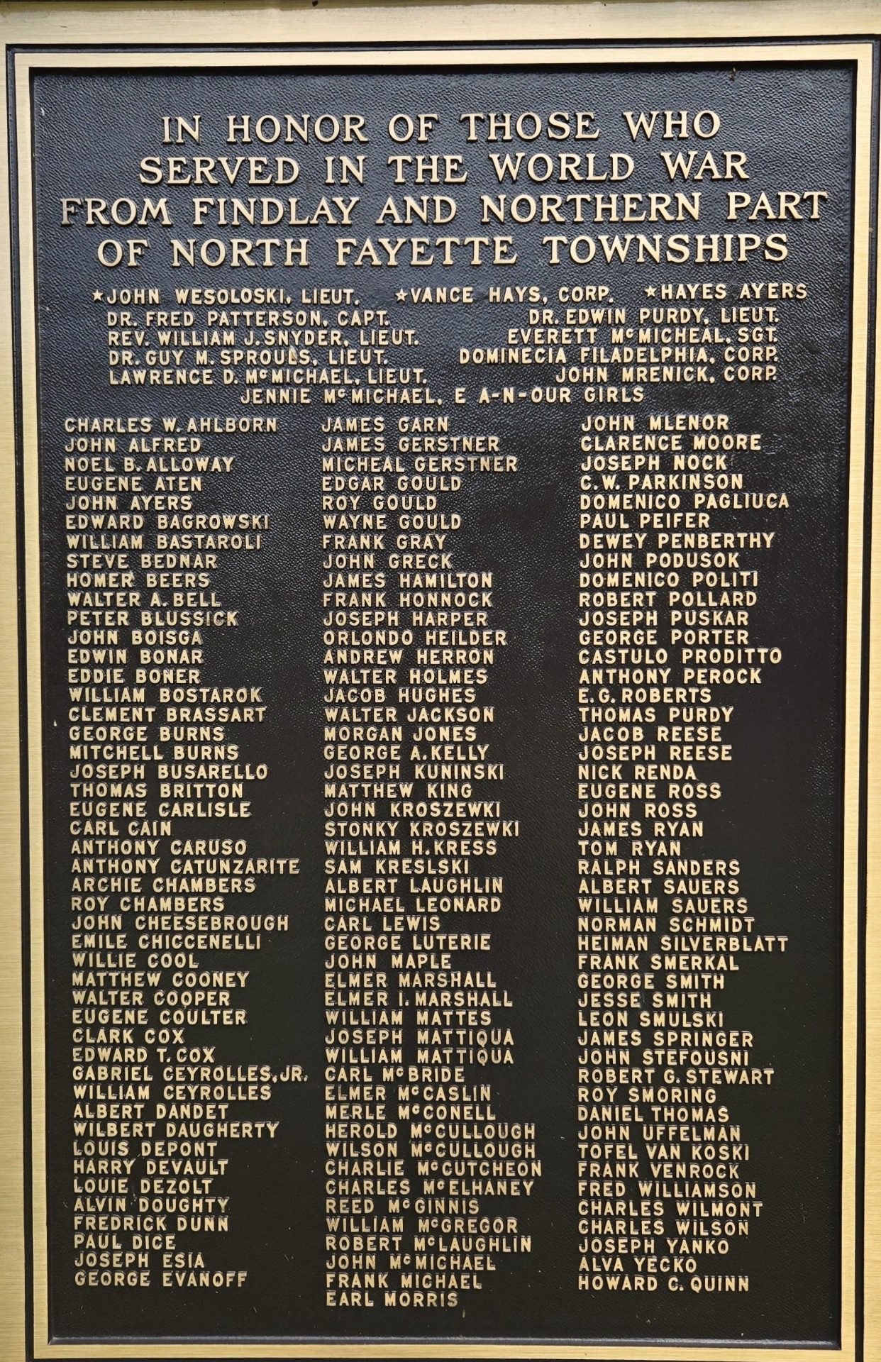 FINDLAY AND NORTHERN PART OF NORTH FAYETTE TOWNSHIPS MEMORIAL PLAQUE