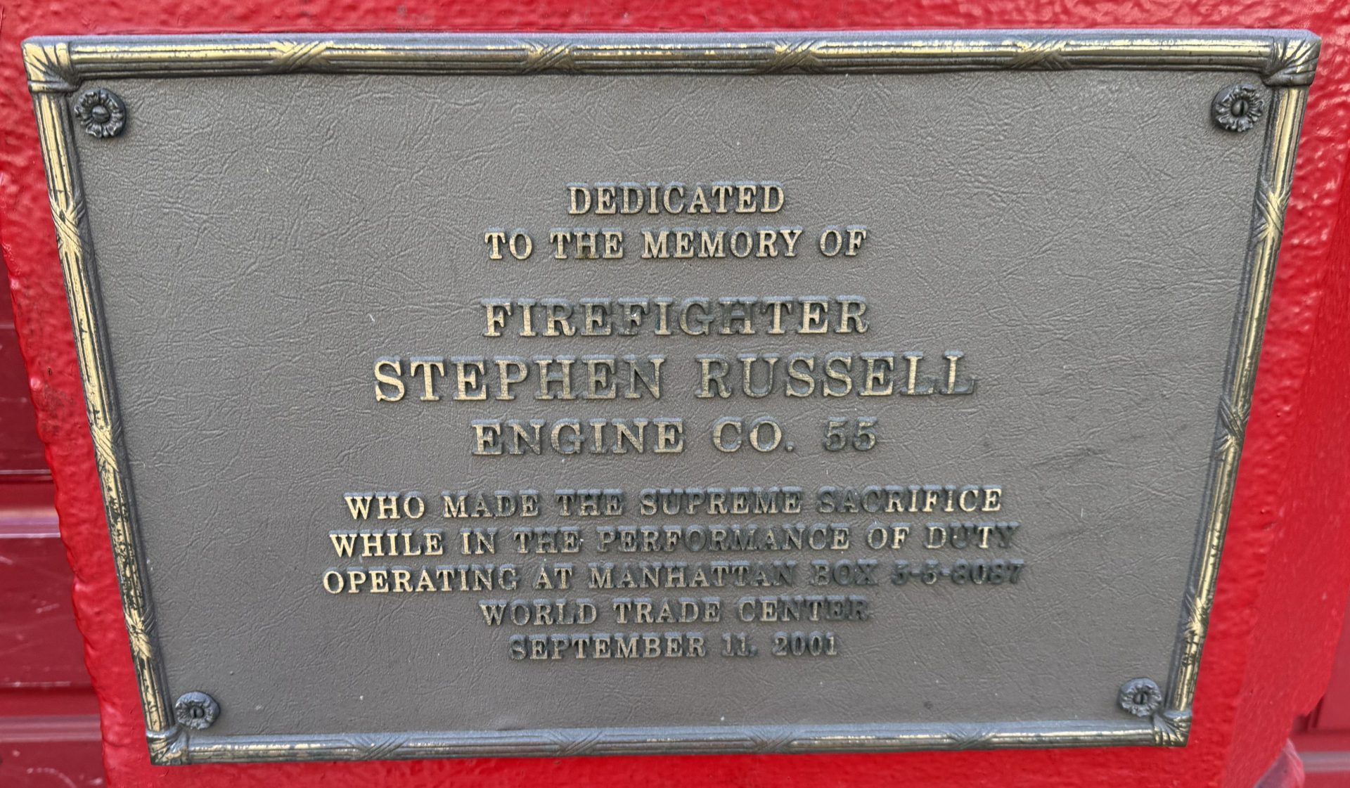 FIREFIGHTER STEPHEN RUSSELL SEPTEMBER 11, 2001 MEMORIAL PLAQUE