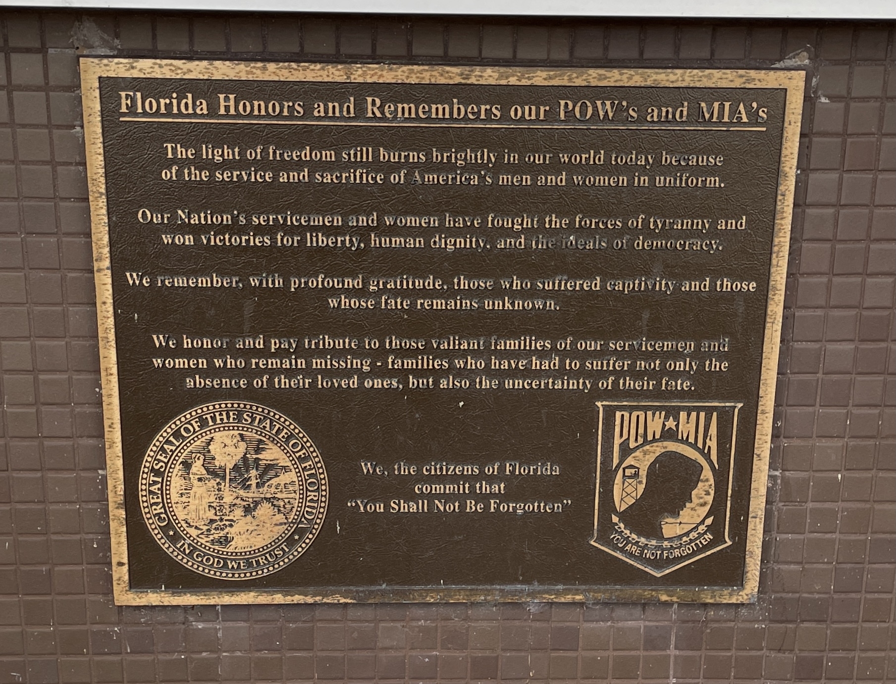 FLORIDA HONORS AND REMEMBERS OUR POW’S AND MIA’S MEMORIAL PLAQUE FORT PIERCE
