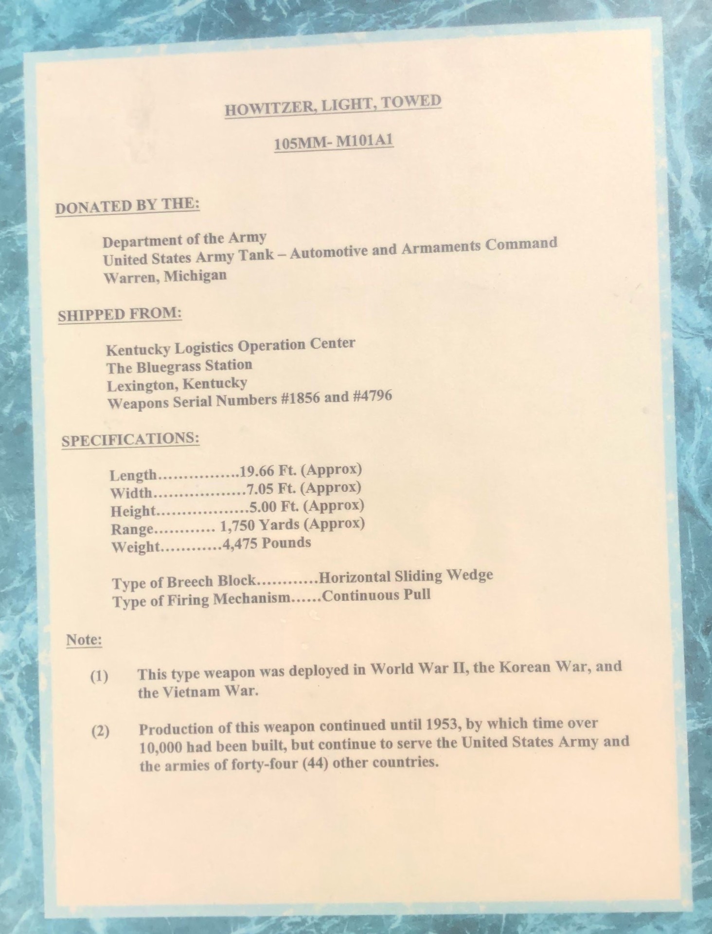 Wars Commemorated: WORLD WAR II, KOREAN WAR AND VIETNAM WAR