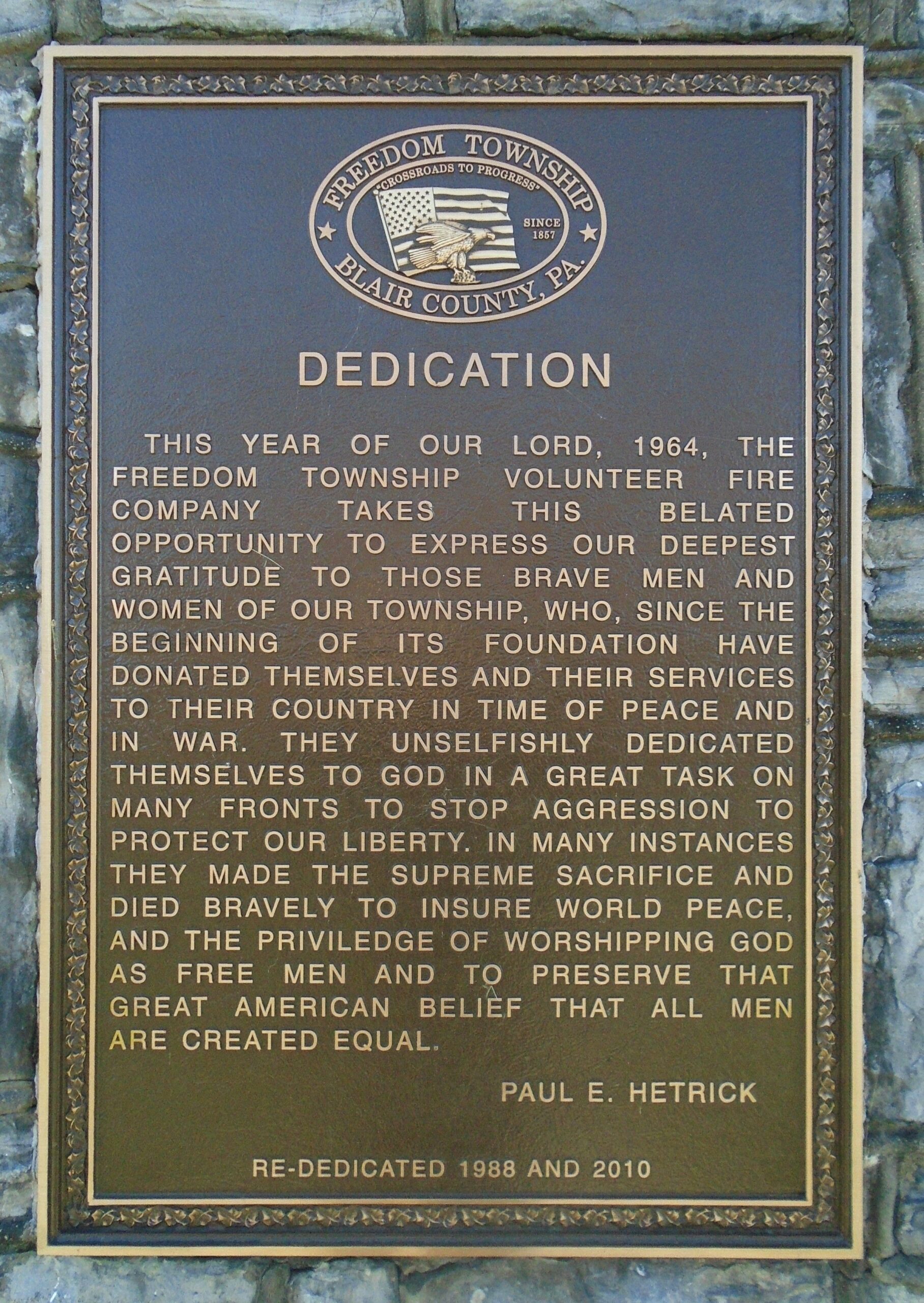 FREEDOM TOWNSHIP VOLUNTEER FIRE COMPANY VETERANS MEMORIAL PLAQUE
