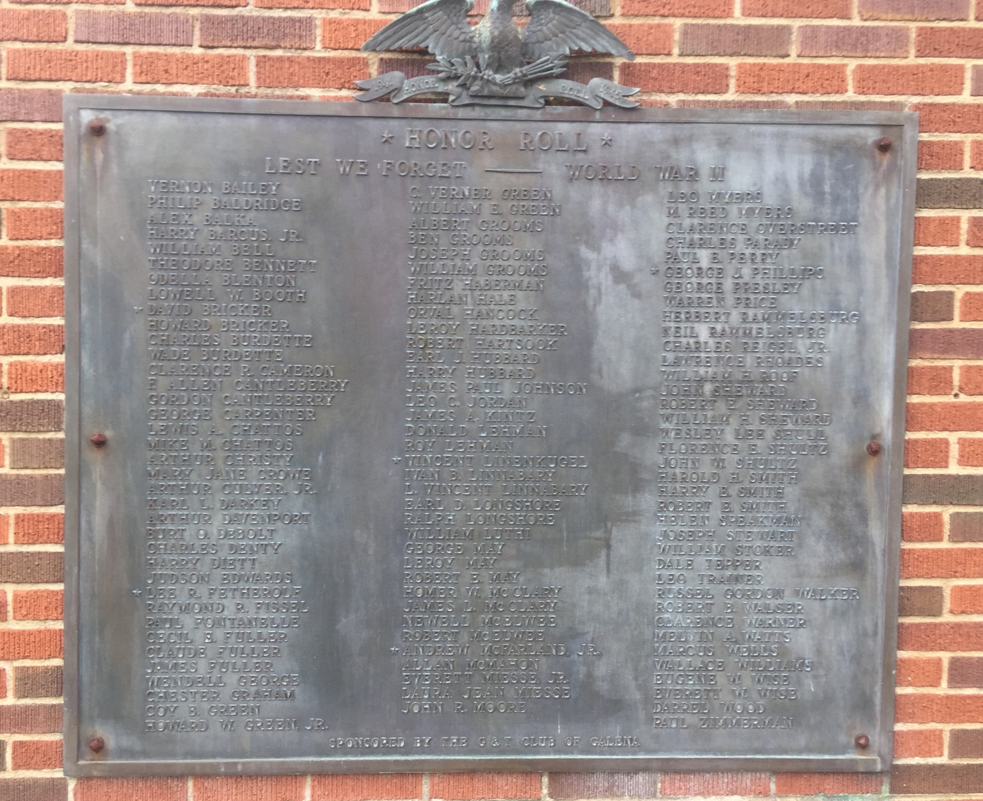G & T CLUB OF GALENA WORLD WAR II MEMORIAL PLAQUE