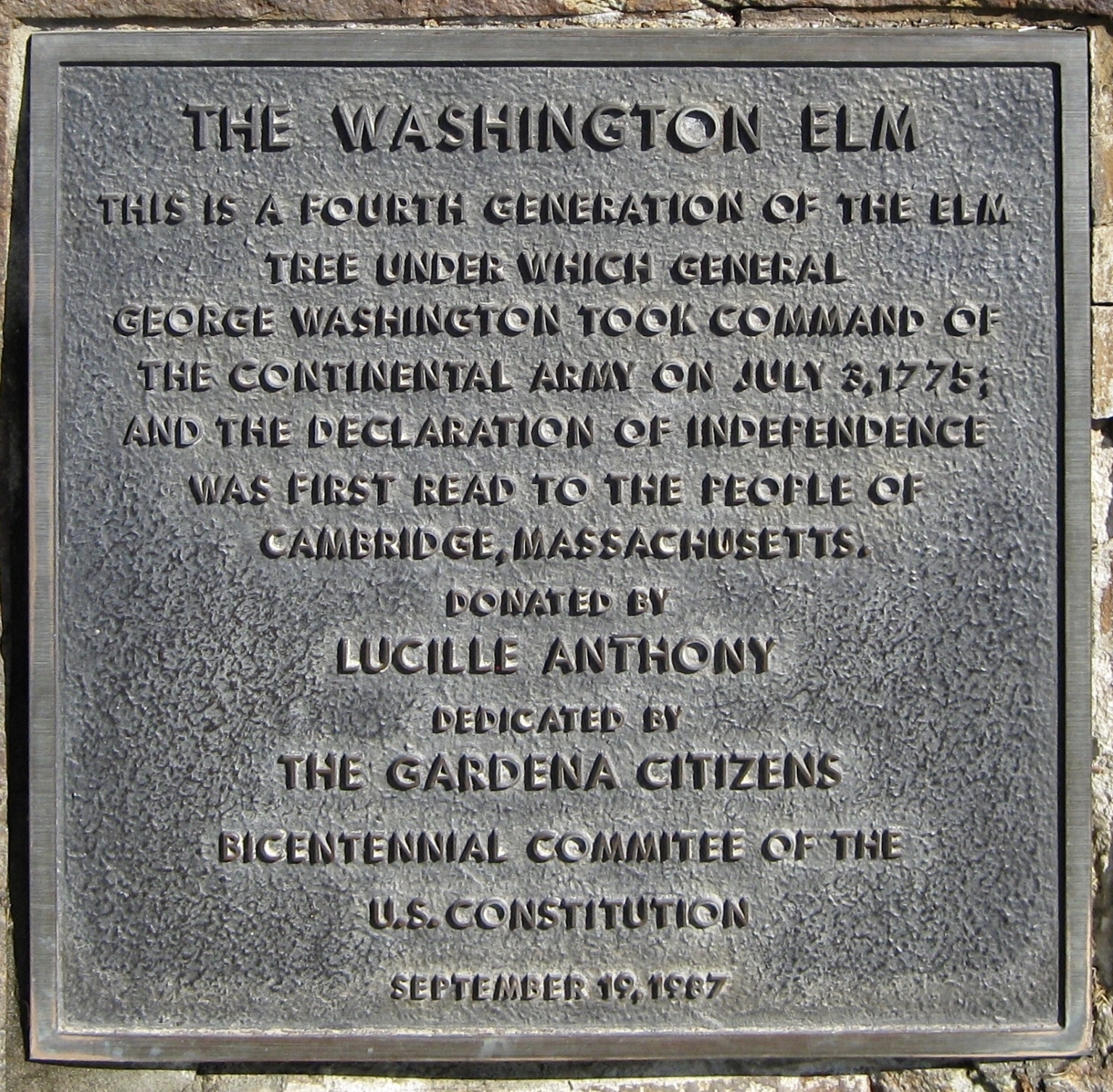 GARDENA THE WASHINGTON ELM MEMORIAL TREE PLAQUE