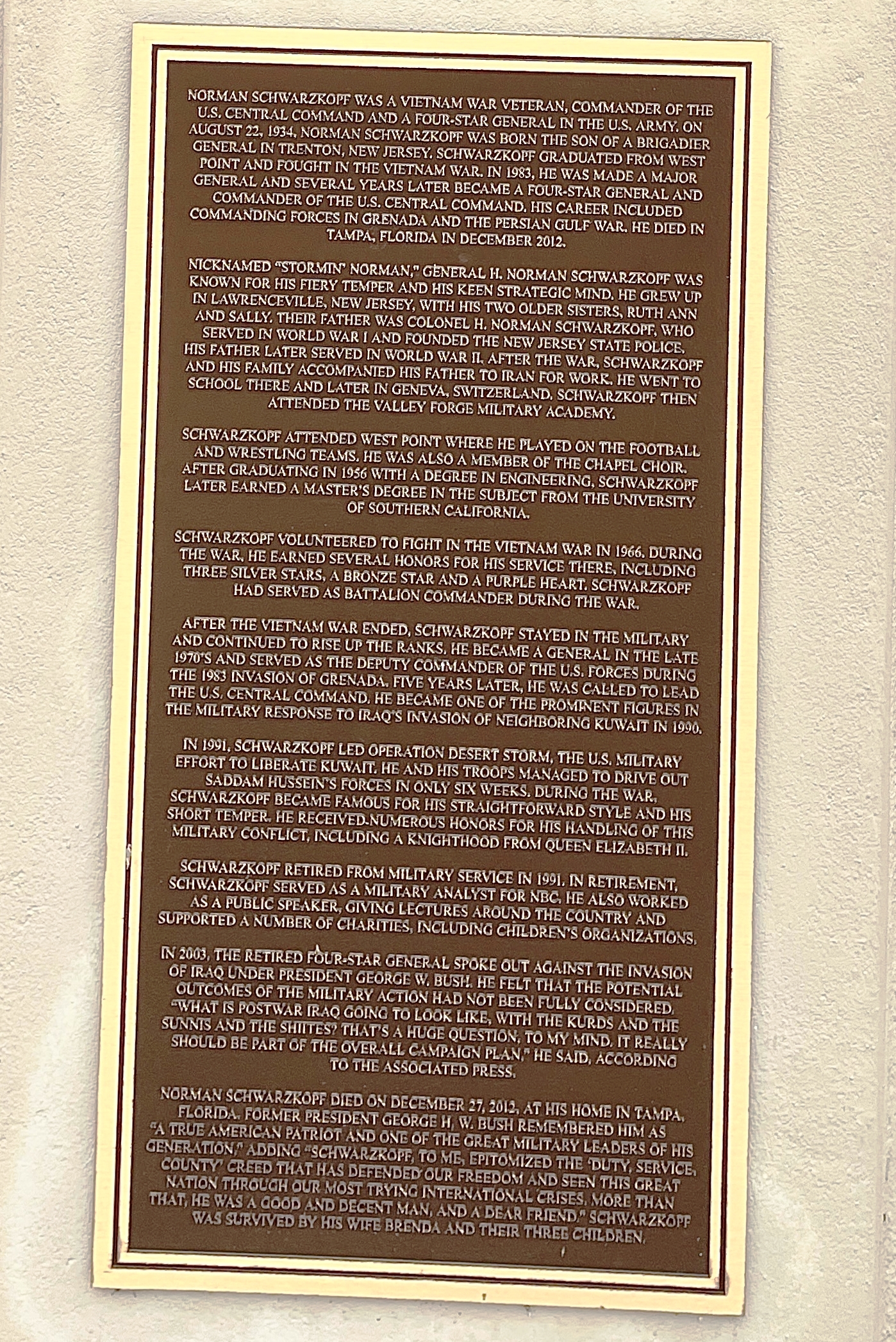 GEN. NORMAN SCHWARZKOPE WAR MEMORIAL PLAQUE B