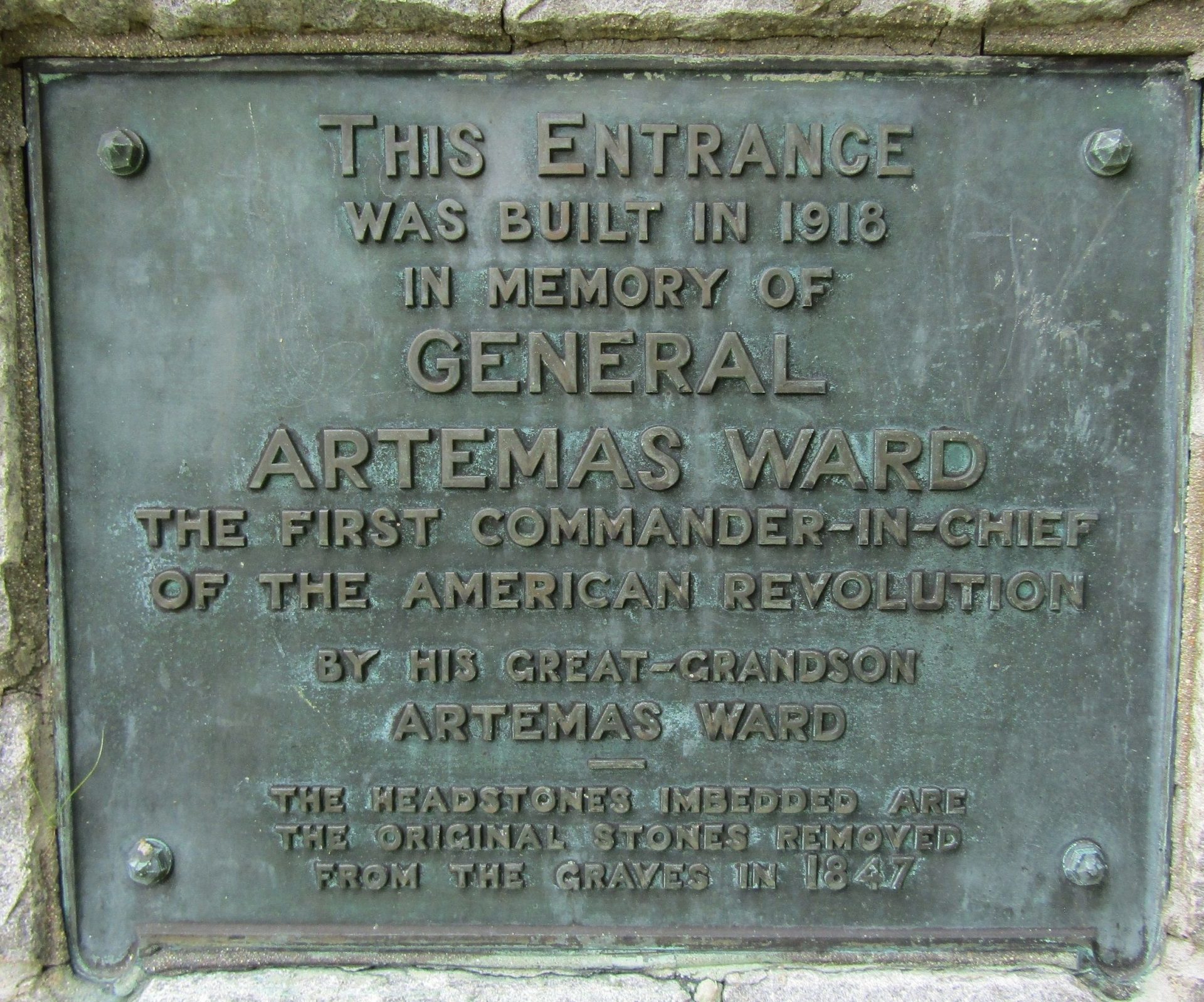 GENERAL ARTEMAS WARD REVOLUTIONARY WAR MEMORIAL ENTRANCE PLAQUE