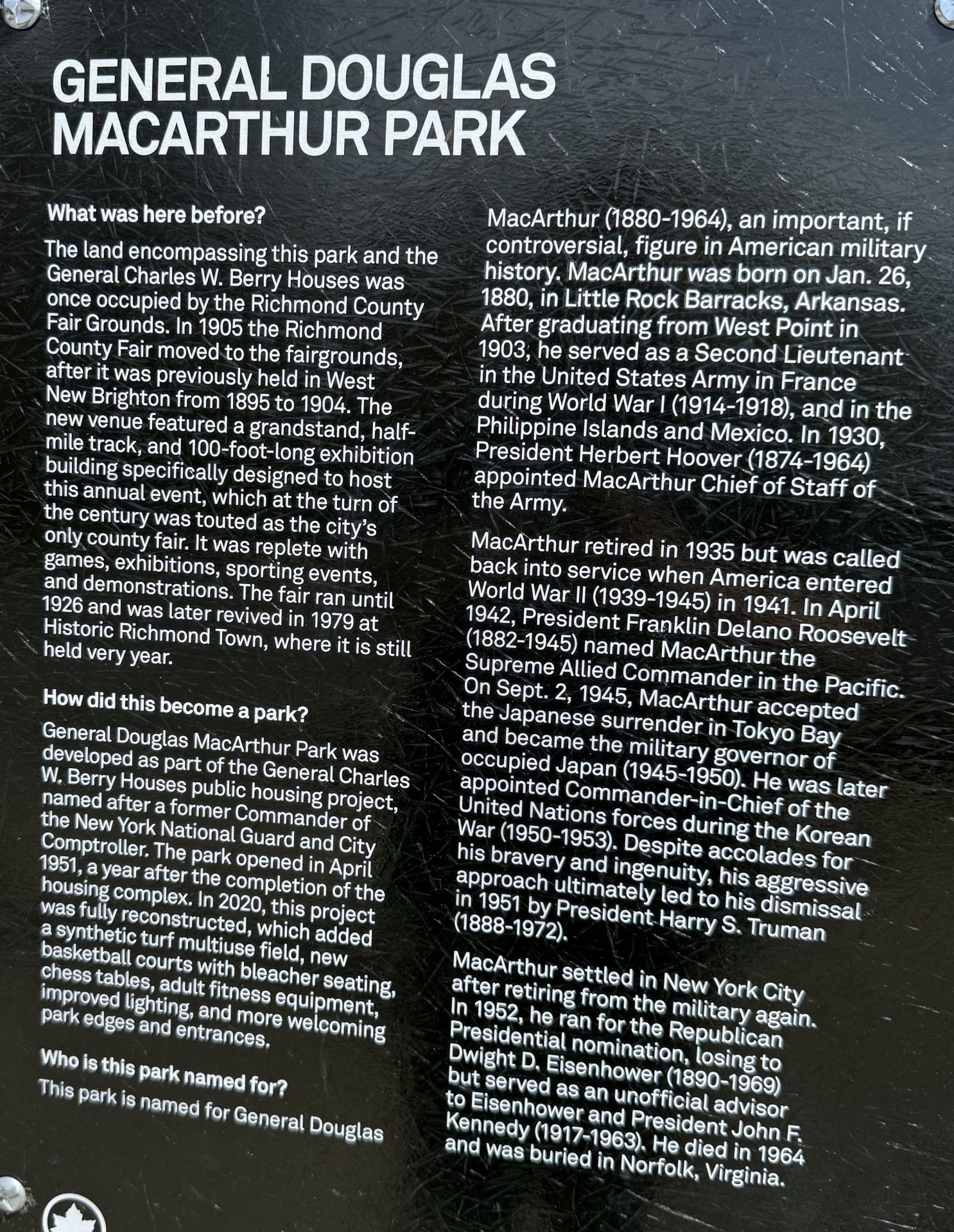 GENERAL DOUGLAS MACARTHUR PARK MEMORIAL PLAQUE