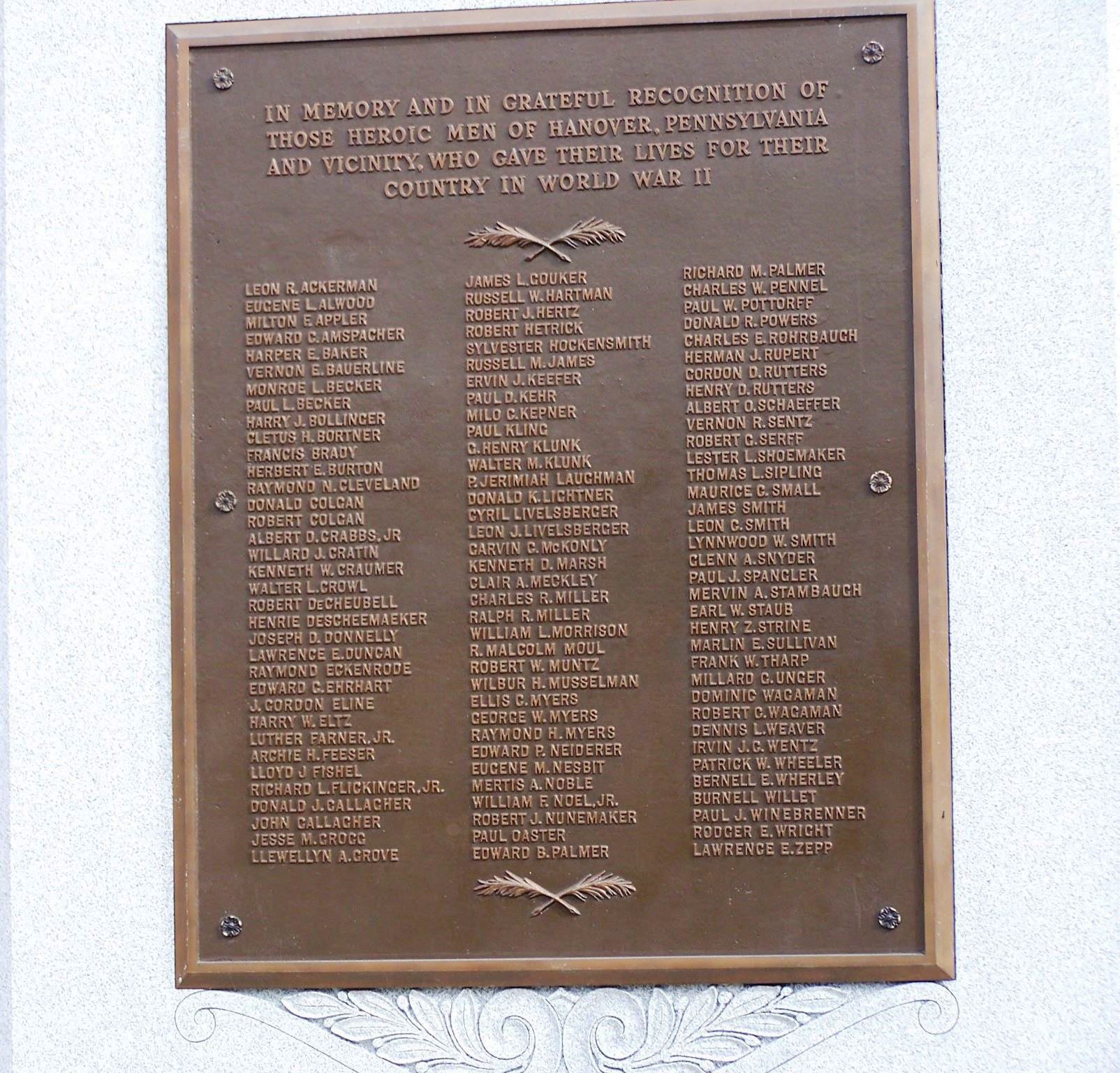 HANOVER WORLD WAR II MEMORIAL PLAQUE