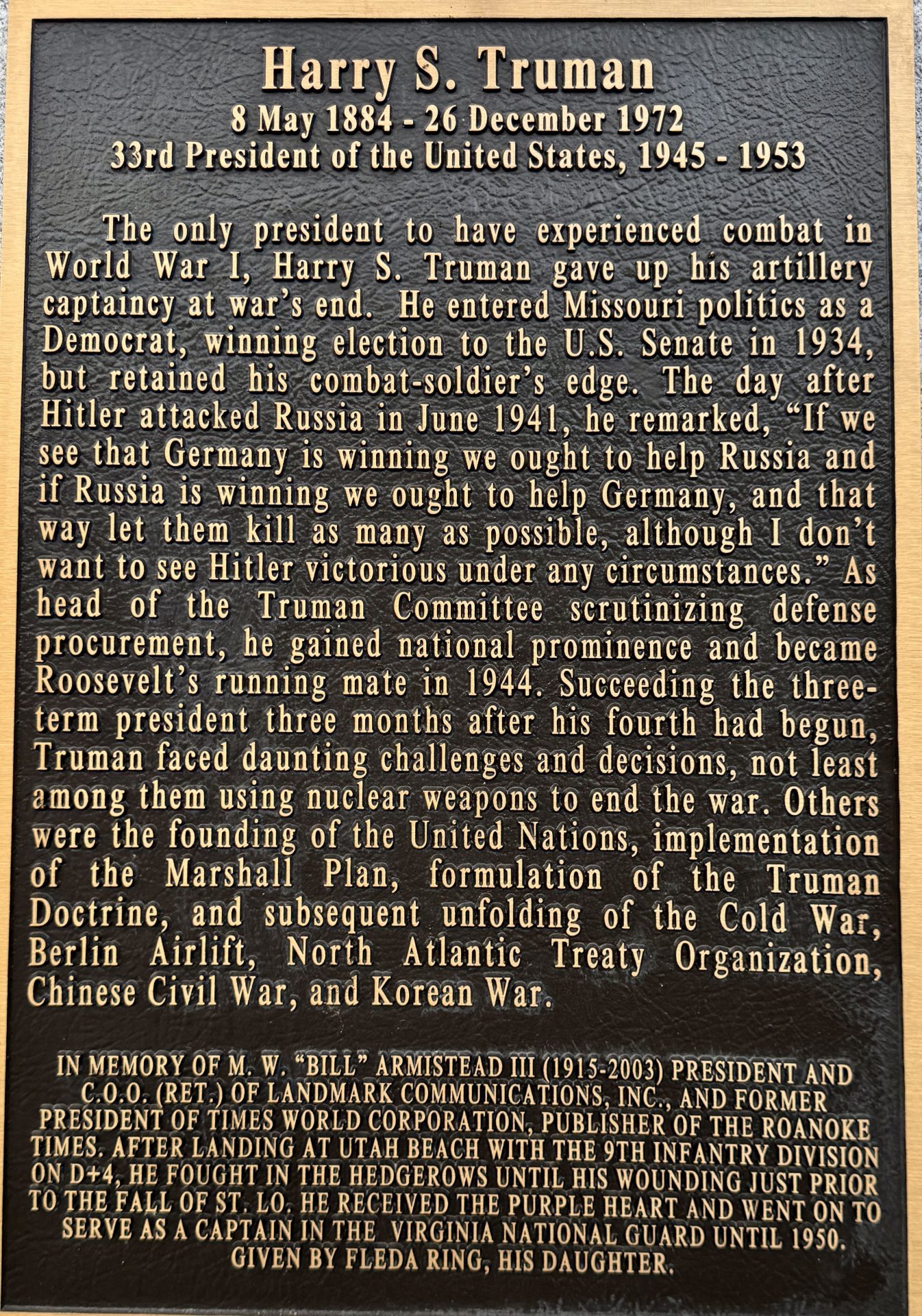 HARRY S. TRUMAN WAR MEMORIAL PLAQUE