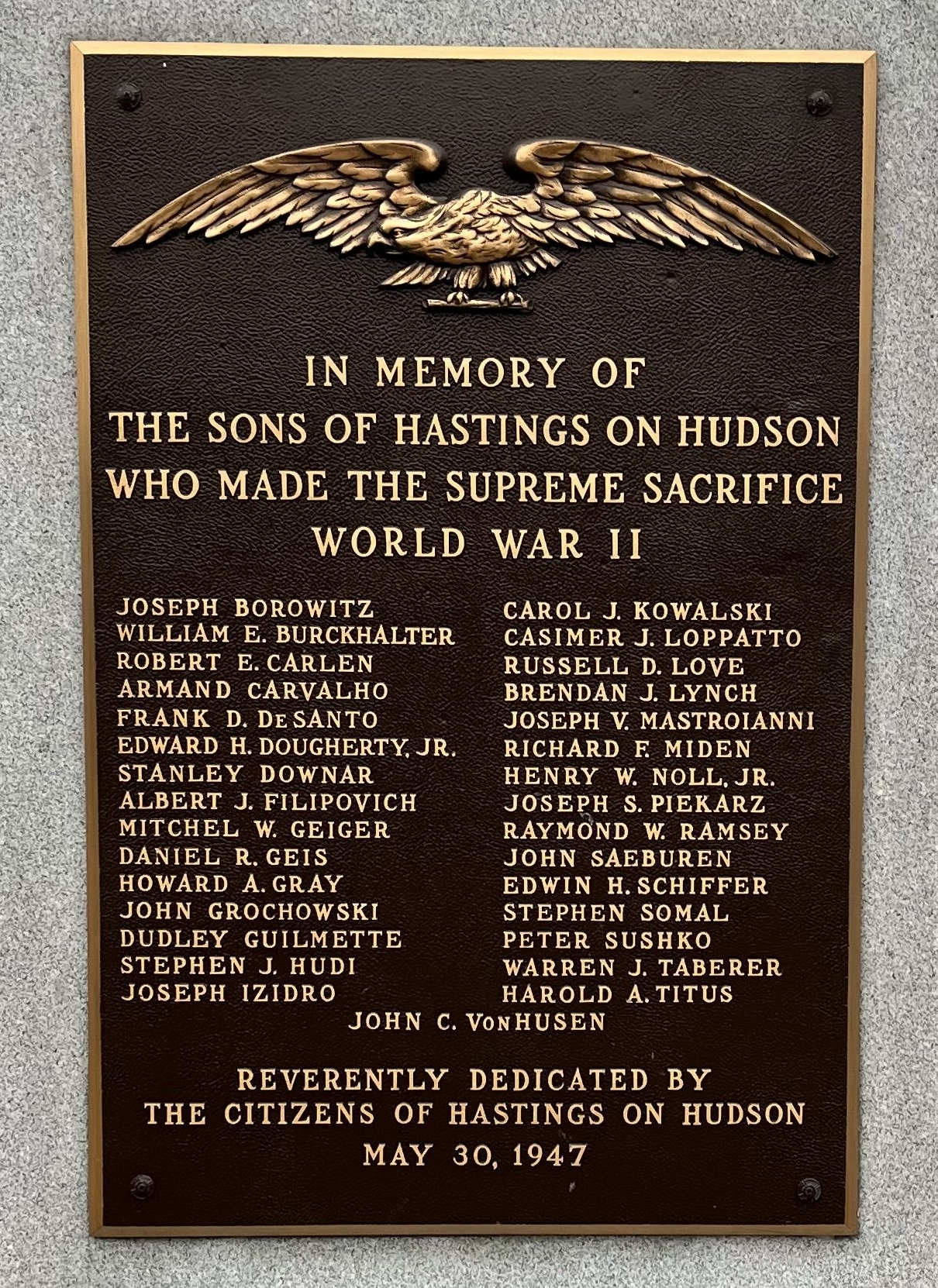 HASTINGS ON HUDSON WORLD WAR II SUPREME SACRIFICE MEMORIAL PLAQUE