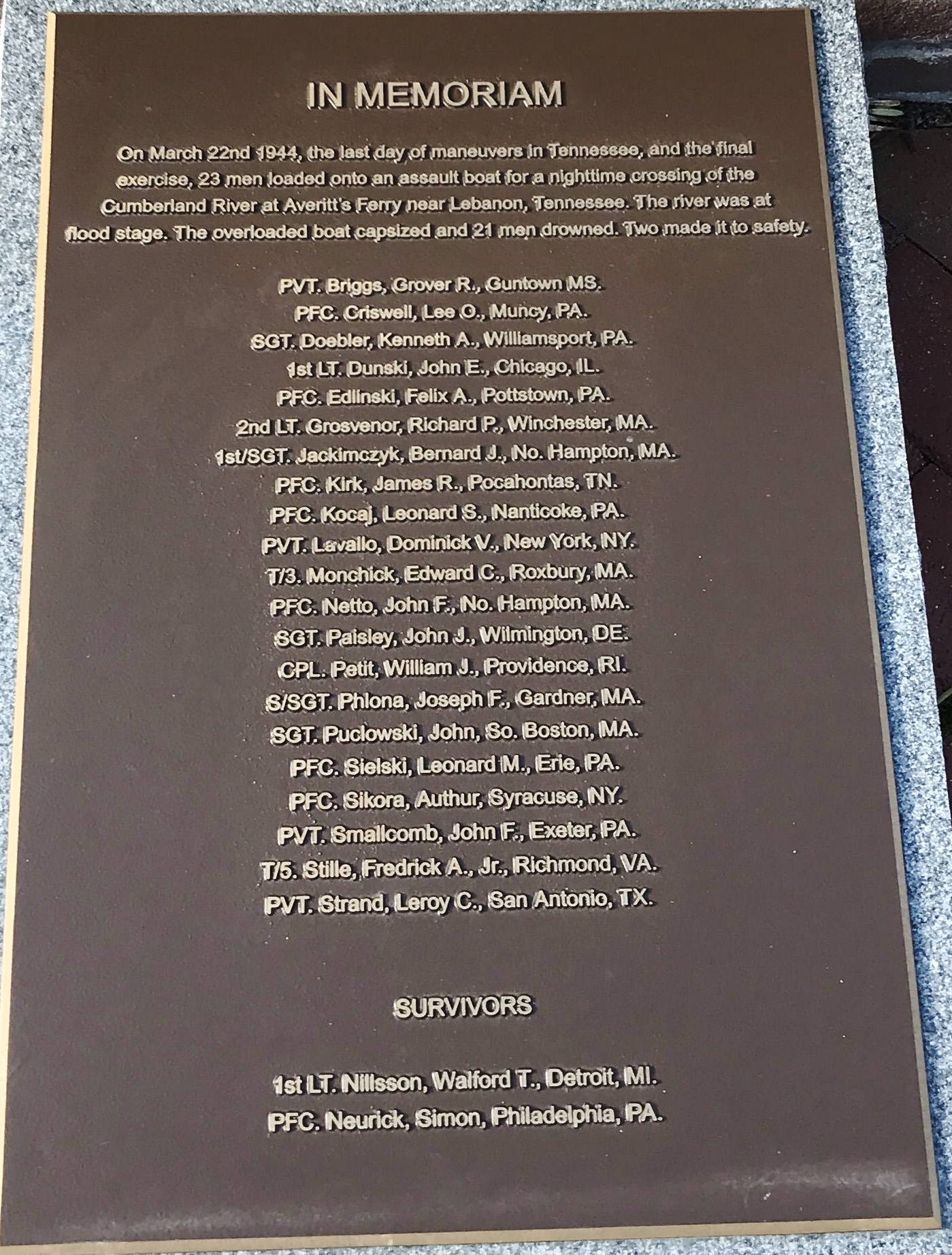 IN MEMORIAM MANEUVERS IN TENNESSEE WAR MEMORIAL PLAQUE