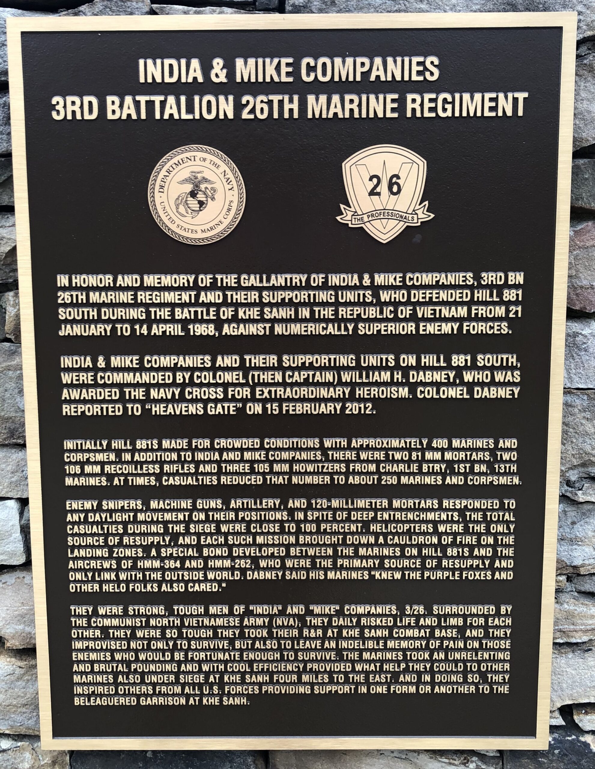 INDIA & MIKE COMPANIES 3RD BATTALION 26TH MARINE REGIMENT MEMORIAL PLAQUE