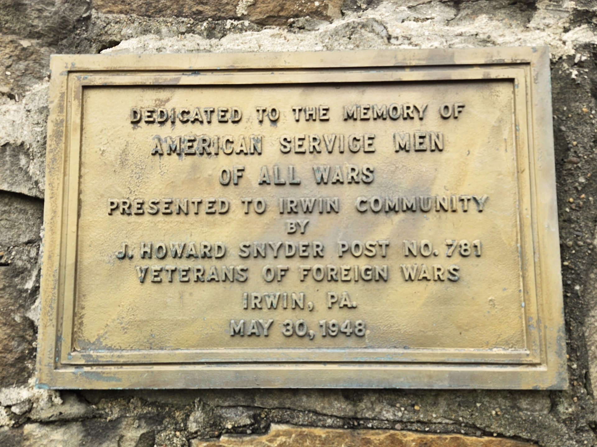 J. HOWARD SNYDER POST NO. 781 WAR VETERANS MEMORIAL PLAQUE