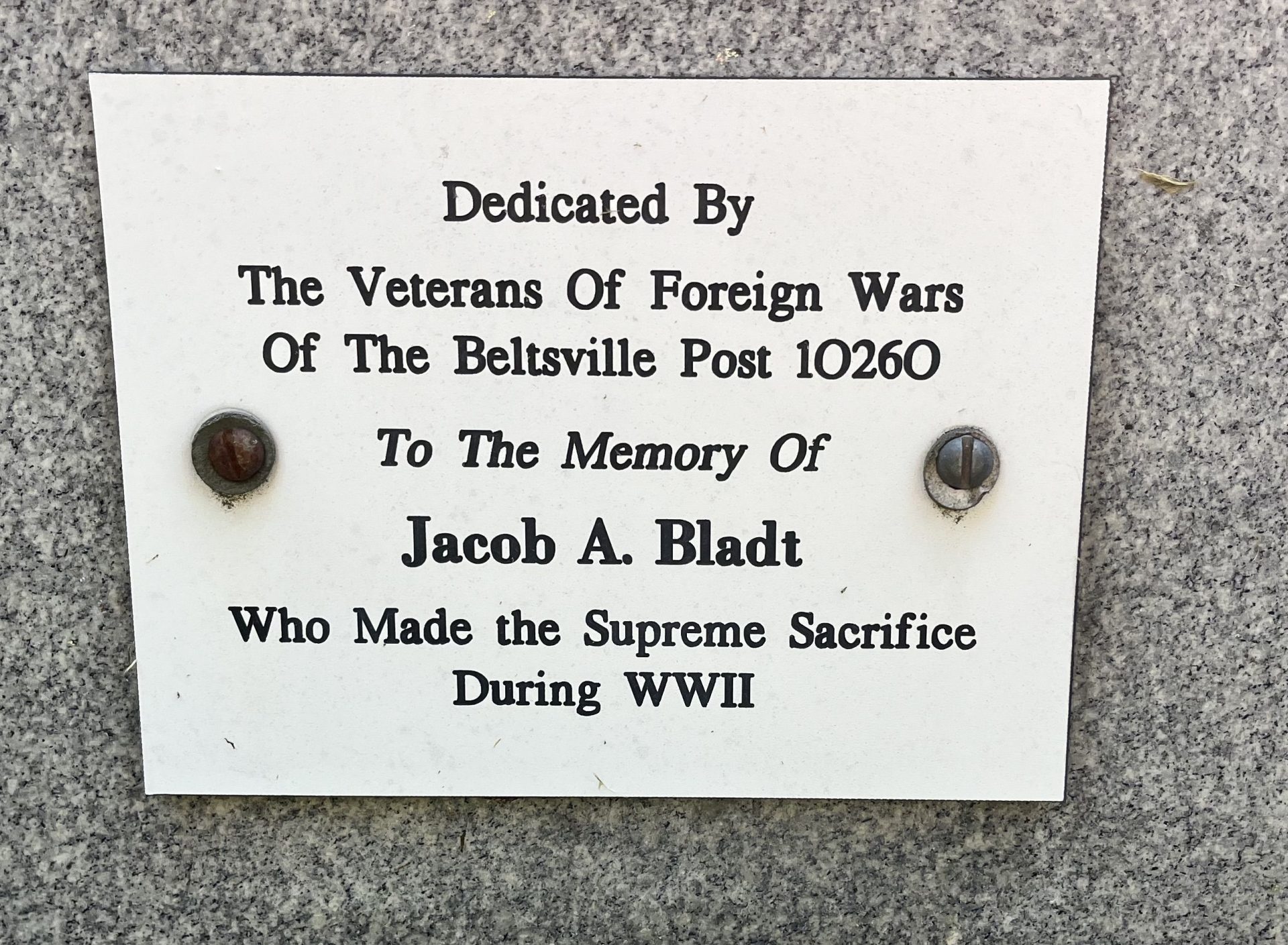 JACOB A. BLADT WAR MEMORIAL PLAQUE