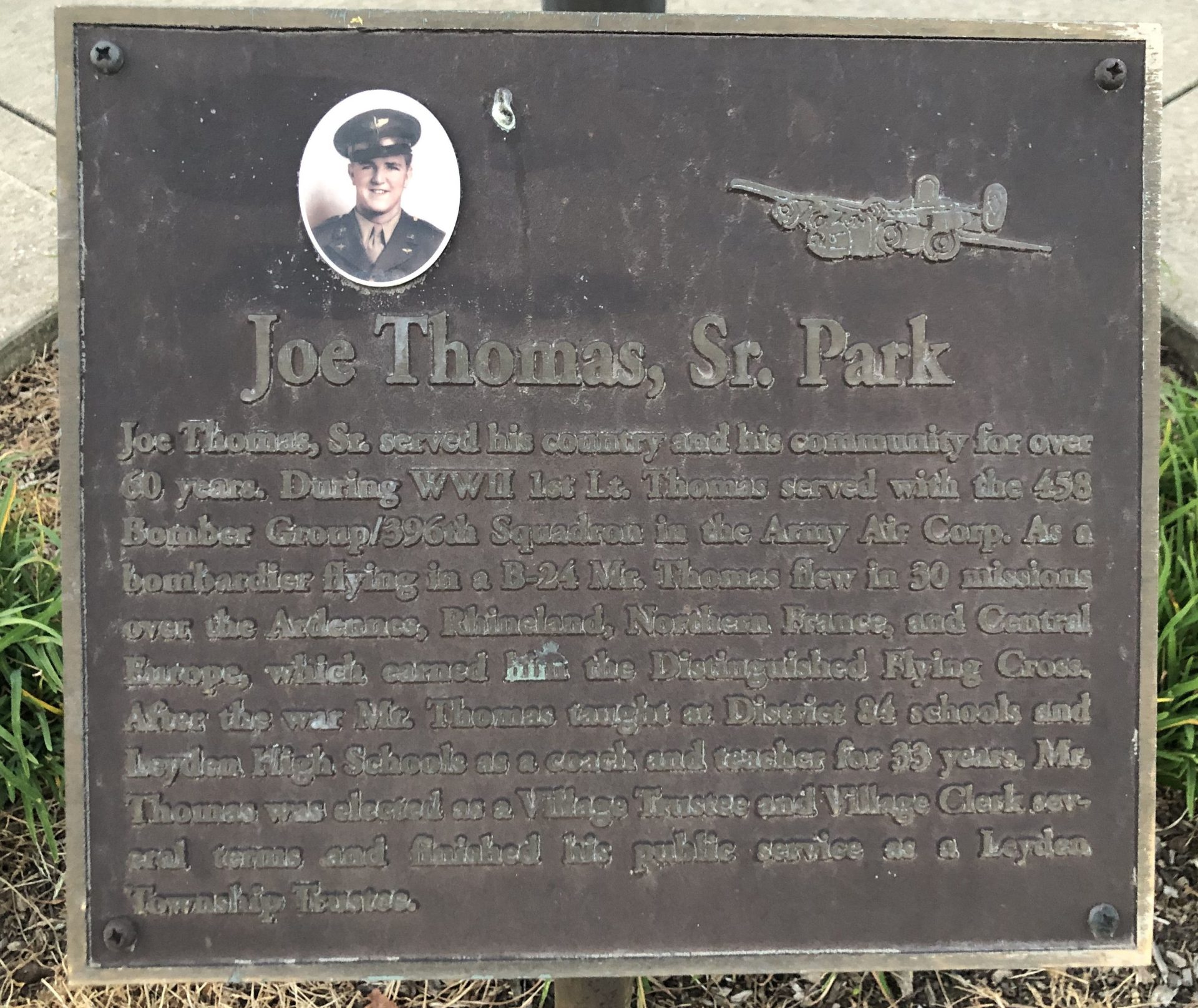 Joe Thomas, Sr. served his country and his community for over 60 years. During WWII 1st Lt. Thomas served with the 458 Bomber Group/396th Squadron in the Army Air Corp. As a bombadier flying in a B-24 Mr. Thomas flew in 30 missions over the Ardennes, Rhineland, Northern France, and Central Europe, which earned him the Distinguished Flying Cross. After the war Mr. Thomas taught at District 84 schools and Leyden High Schools as a coach and teacher for 33 years. Mr. Thomas was elected as a Village Trustee and Village Clerk several terms and finished his public service as a Leyden Township Trustee.