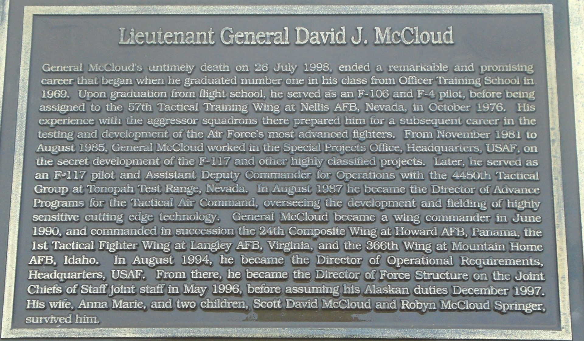 LIEUTENANT GENERAL DAVID J. MCCLOUD MEMORIAL PLAQUE