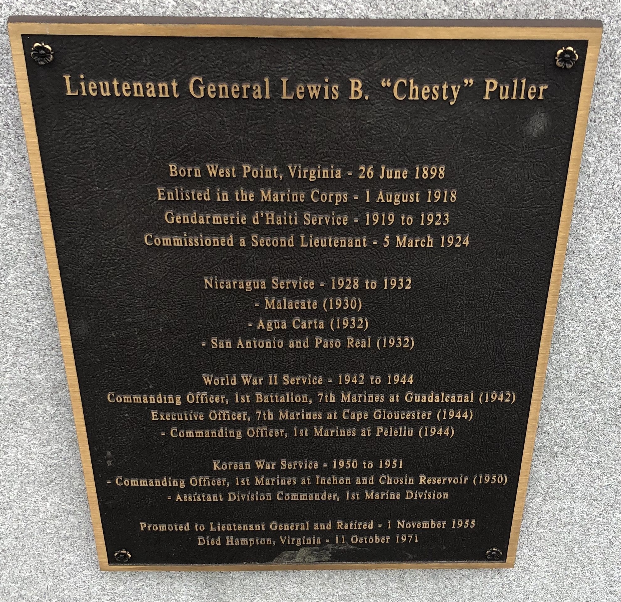 LIEUTENANT GENERAL LEWIS B. “CHESTY” PULLER MEMORIAL PLAQUE A