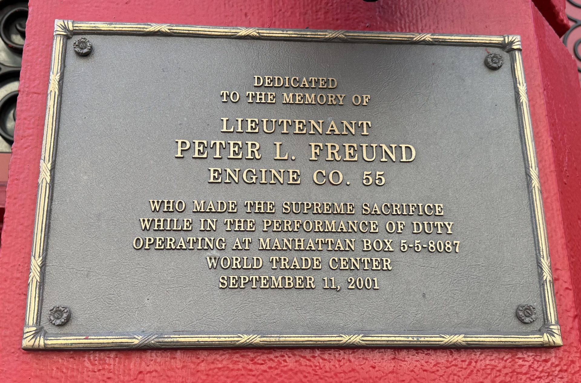LIEUTENANT PETER L. FREUND SEPTEMBER 11, 2001 MEMORIAL PLAQUE