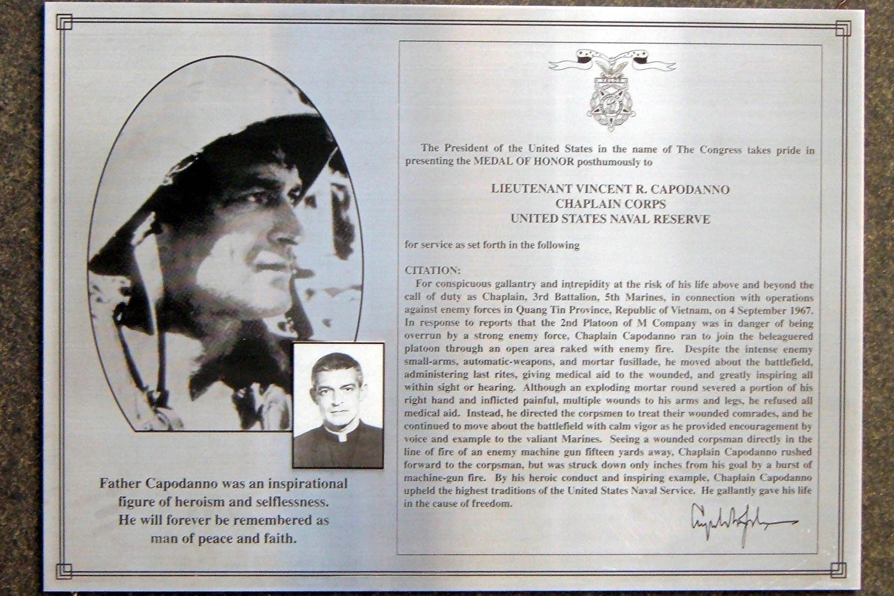 LIEUTENANT VINCENT R. CAPODANNO MEDAL OF HONOR WAR MEMORIAL PLAQUE
